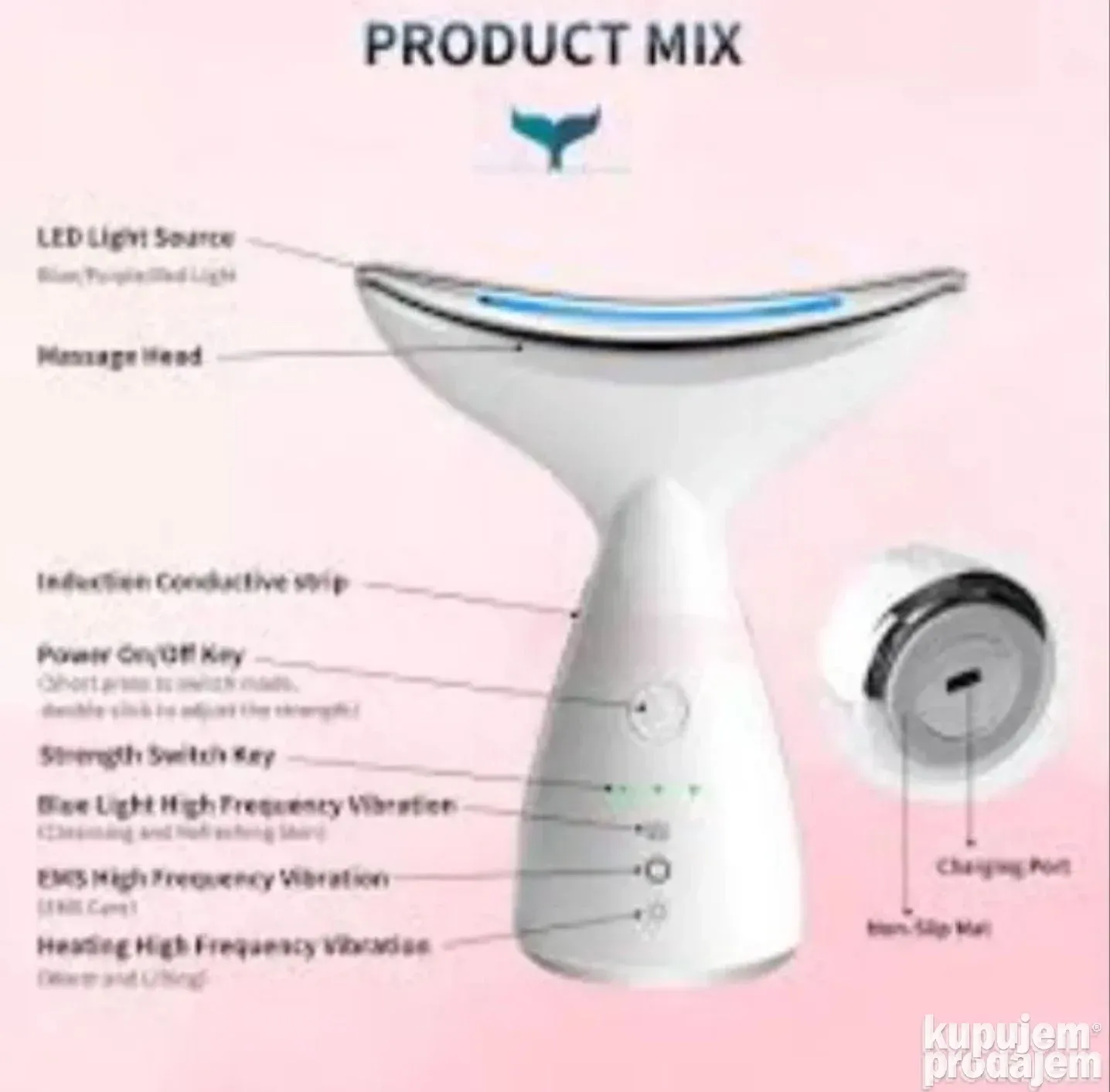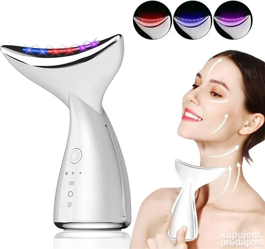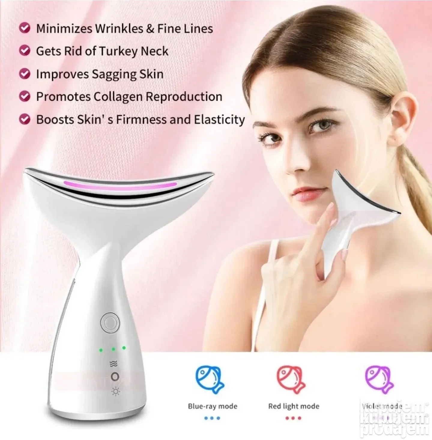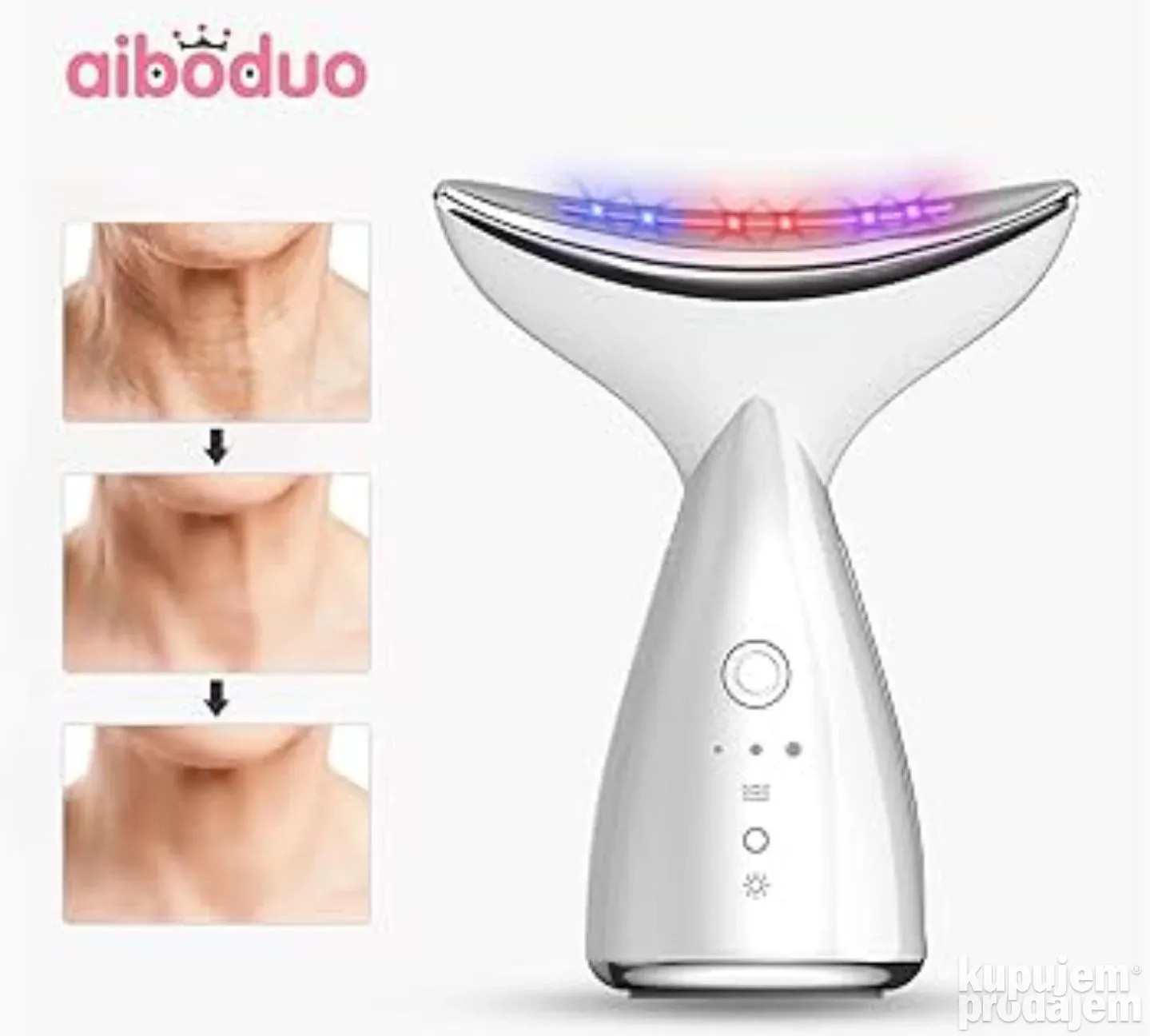 Aparat za uklanjanje bora i podmlađivanje kože kombinovani je LED fotonski uređaj + EMS masažer koji deluje na vrat, lice i područje ispod brade. Koristi vibracije, toplinu i fotonsku terapiju u tri boje kako bi zategao kožu, smanjio bore, poboljšao tonus i podstakao cirkulaciju.