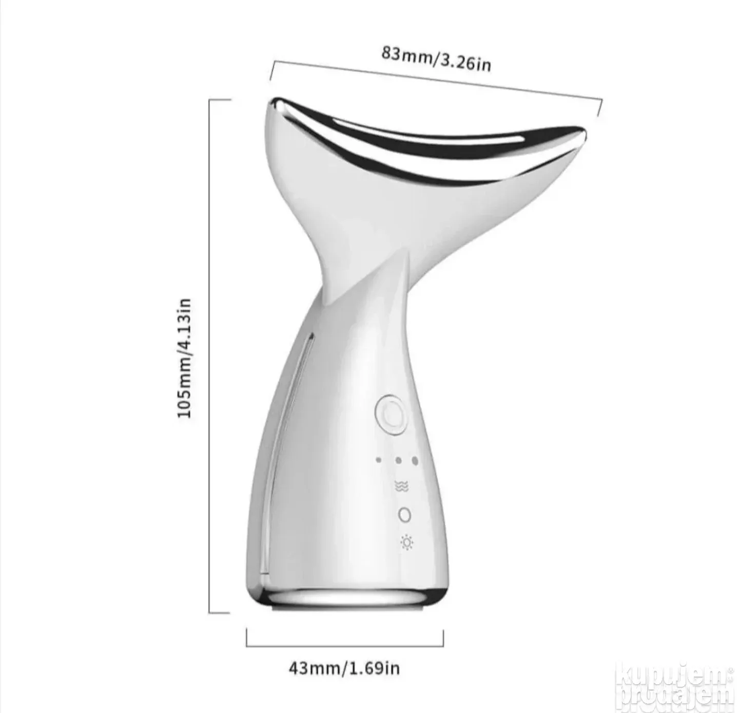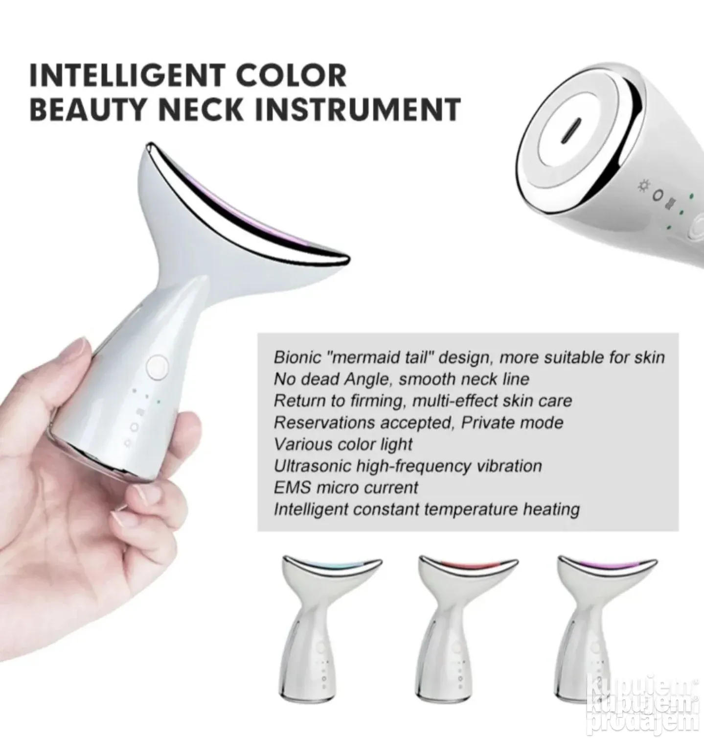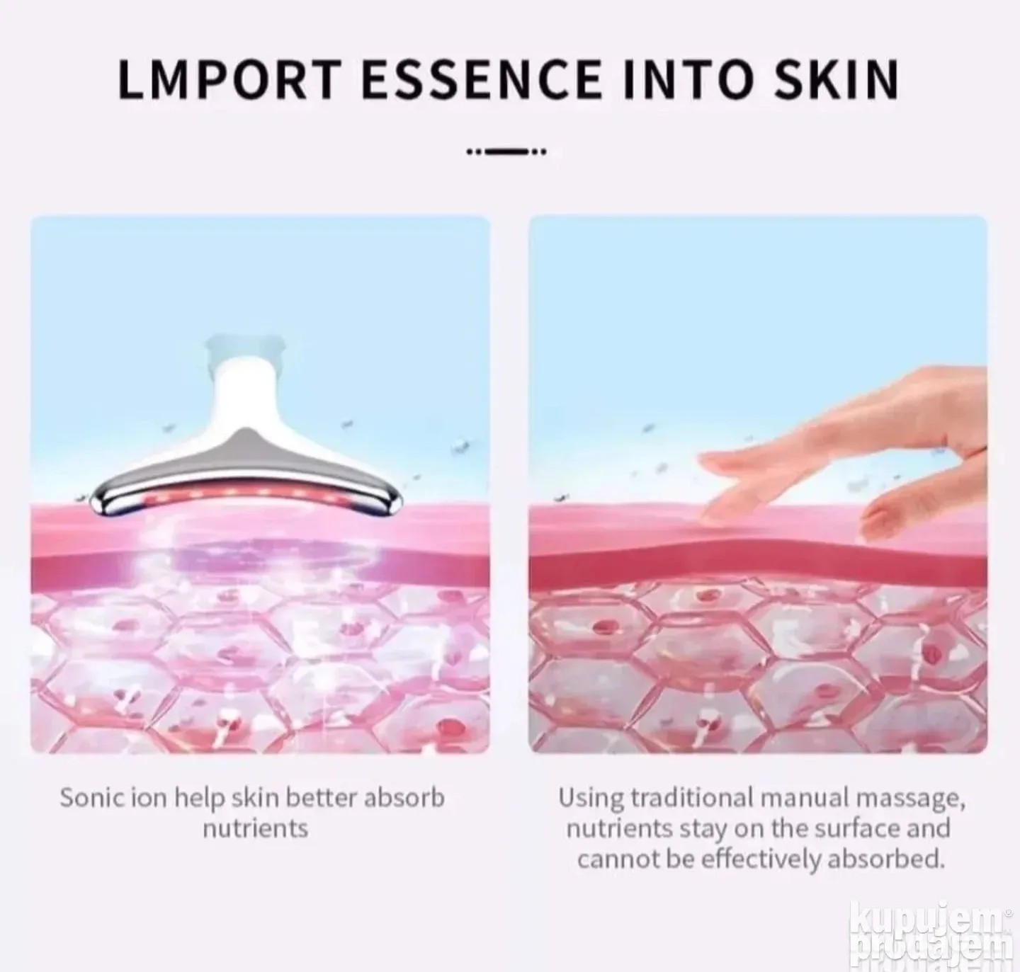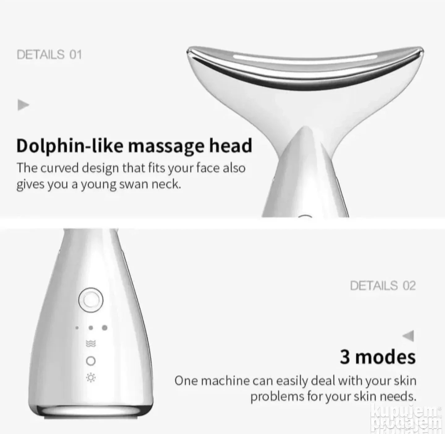 Aparat za uklanjanje bora i podmlađivanje kože kombinovani je LED fotonski uređaj + EMS masažer koji deluje na vrat, lice i područje ispod brade. Koristi vibracije, toplinu i fotonsku terapiju u tri boje kako bi zategao kožu, smanjio bore, poboljšao tonus i podstakao cirkulaciju.