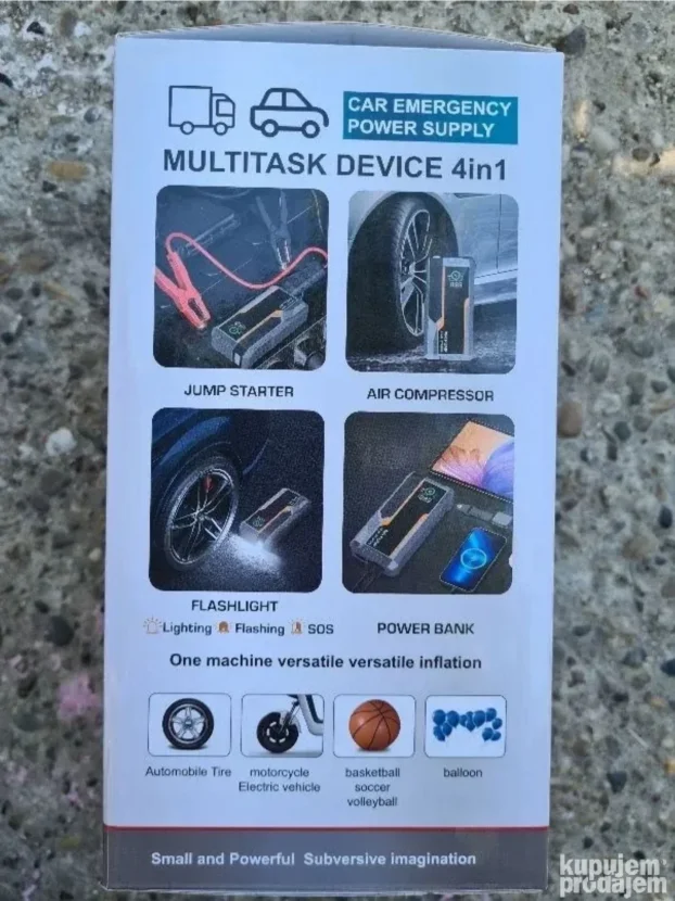 Višefunkcionalni 4-u-1 uređaj: auto starter, kompresor, powerbank i LED lampa.