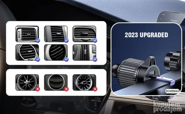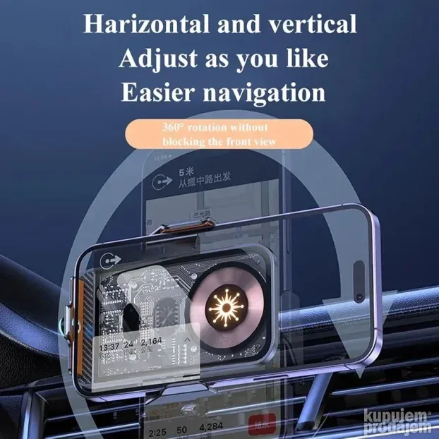 Može se montirati na ventilacioni otvor ili instrument tablu. Podesiv ugao gledanja omogućava rotaciju od 360 stepeni. Moderan dizajn upotpunjuje unutrašnjost automobila i olakšava svakodnevnu upotrebu.