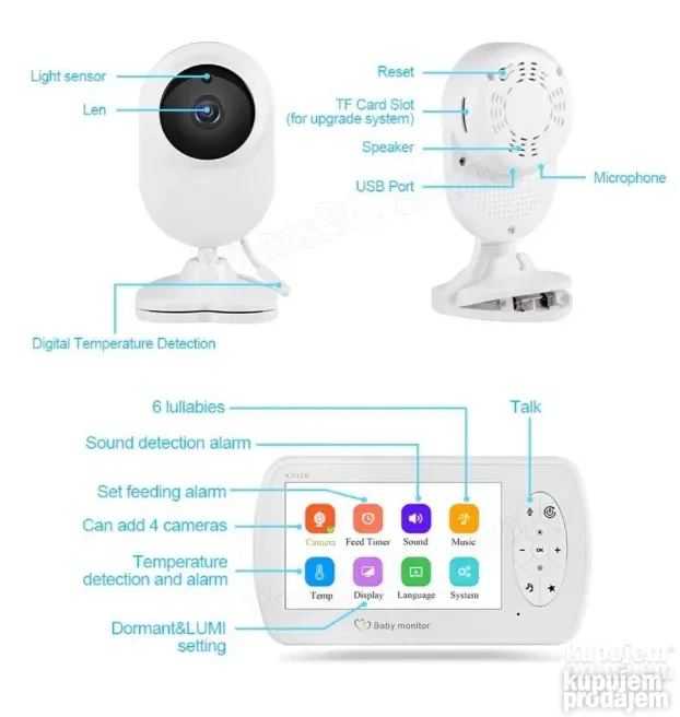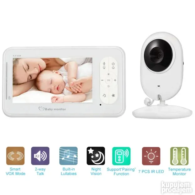 Bebi monitor sa kamerom i termometrom od 4.3″ pruža roditeljima sigurnost i mir dok beba spava. Ovaj bežični monitor u boji omogućava praćenje bebe sa daljine, uz funkciju dvosmernog razgovora i infracrveni noćni vid. Uz integrisanu muziku i termometar za vazduh, pruža optimalnu brigu i udobnost. Idealan je za kućnu upotrebu i kao poklon za nove roditelje.
