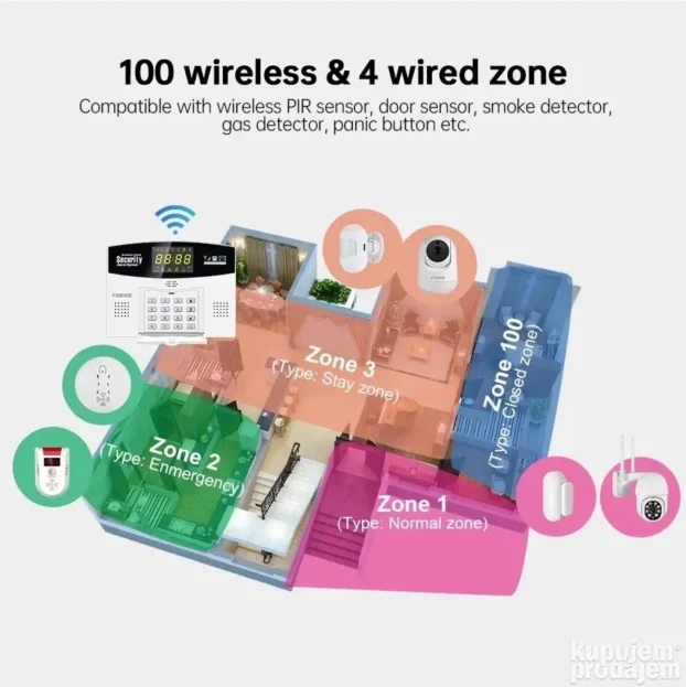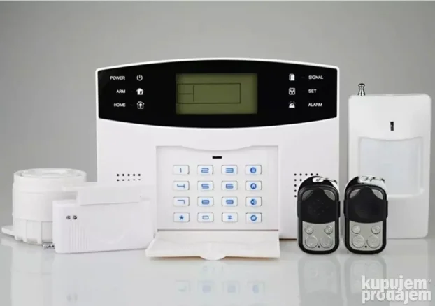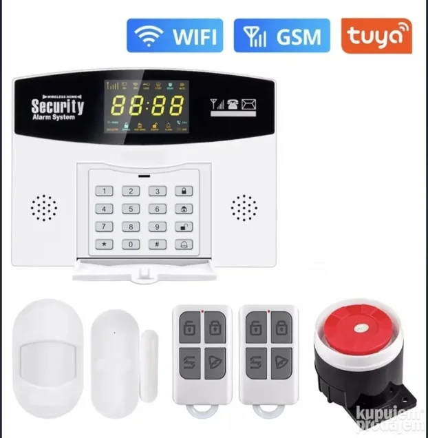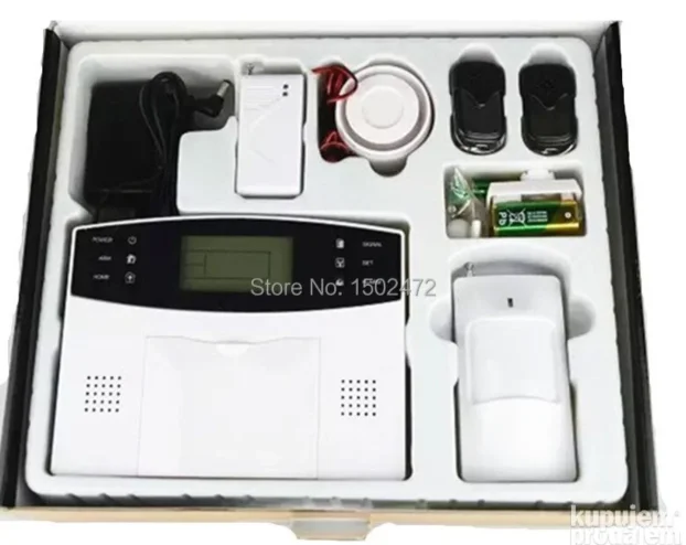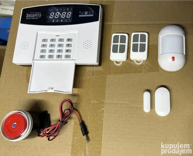 • U pakovanju: alarm, napajanje, senzor pokreta, 2x daljinski, senzor za vrata i prozore, sirena, uputstvo