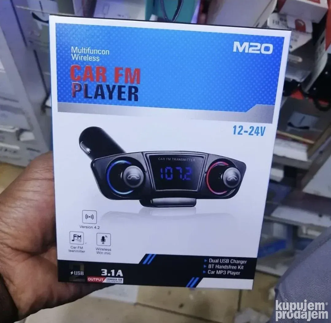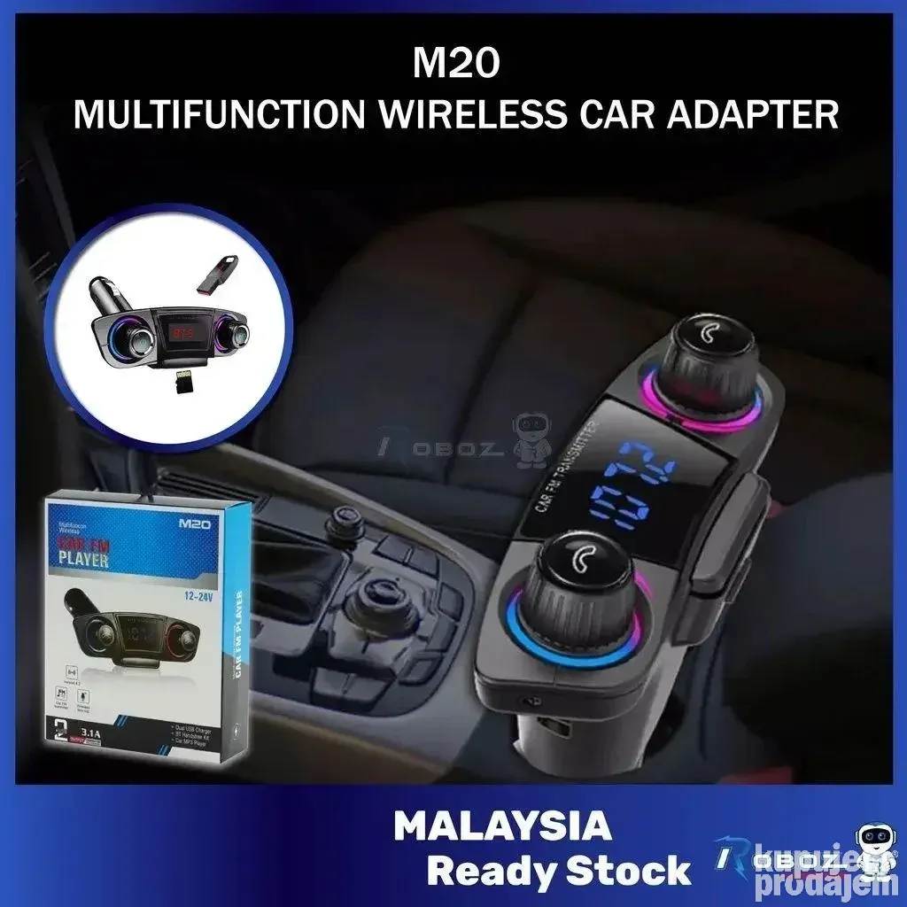 Bluetooth FM transmiter M20 omogućava bežično povezivanje sa telefonom za slušanje muzike i primanje poziva u automobilu. Ima LCD ekran koji jasno prikazuje informacije i jednostavan je za upotrebu. Podržava SD kartice i USB fleš memorije, kao i AUX ulaz i izlaz. Uz to, može puniti telefon tokom vožnje.