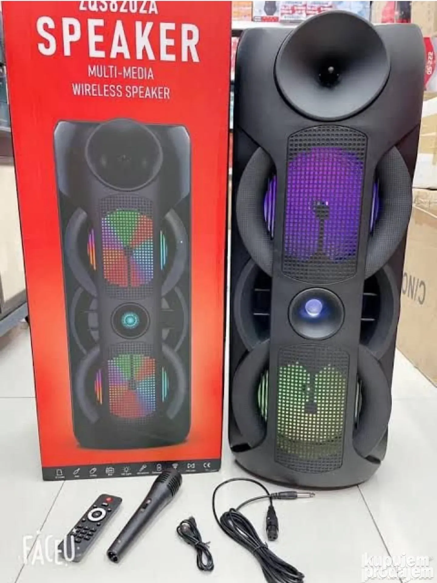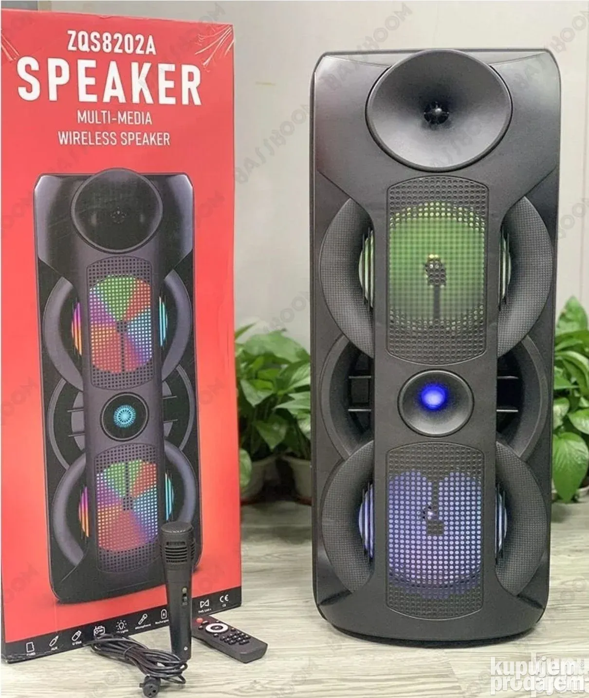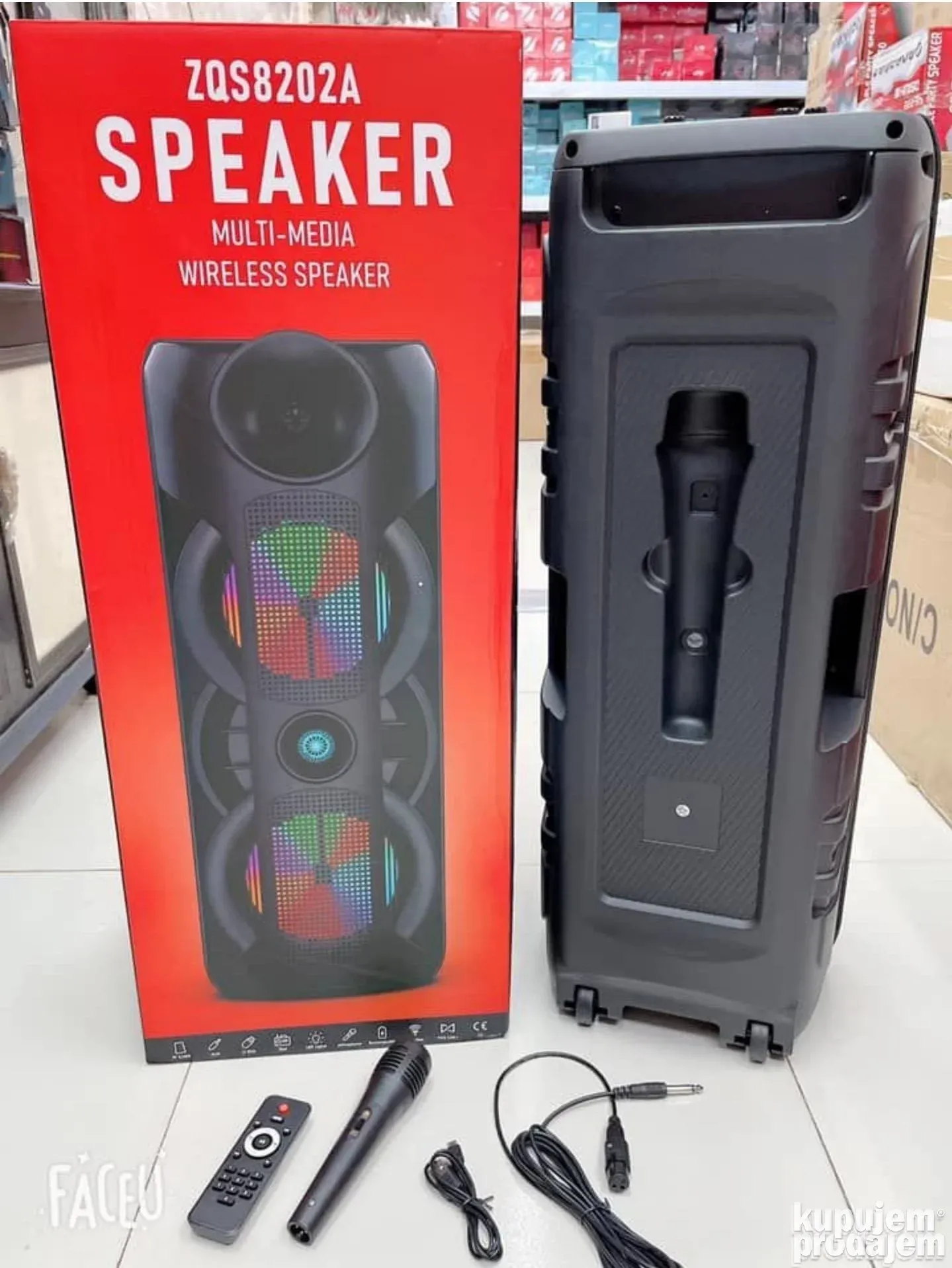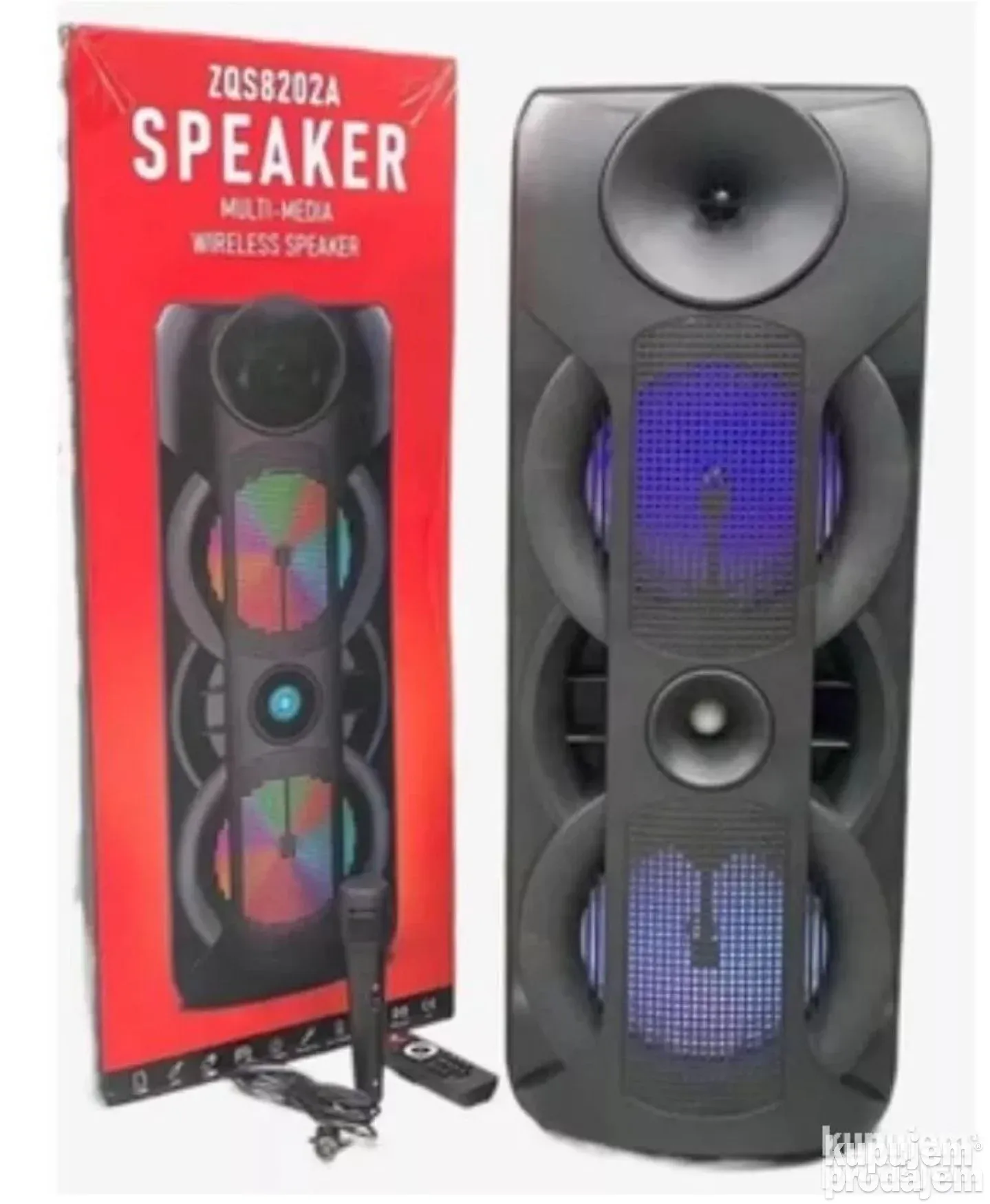 Model ZQS-8202a je prenosivi Bluetooth zvučnik sa dve 8-inčne jedinice i ukupnom snagom od 40W. Idealno rešenje za karaoke, zabave i slušanje muzike. Opremljen je LED svetlima i dolazi sa mikrofonom, USB kablom za punjenje, daljinskim upravljačem, podržava Bluetooth, USB, TF karticu i FM radio. Radi na litijum-jonskoj bateriji od 4500 mAh, što omogućava dugotrajnu zabavu bez prekida.