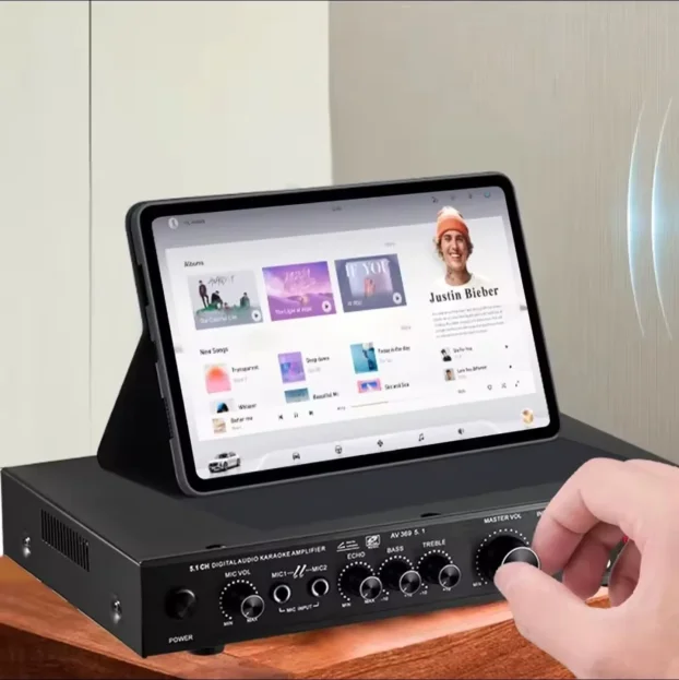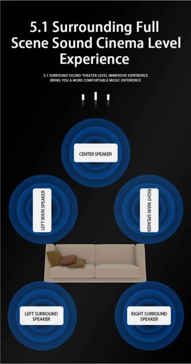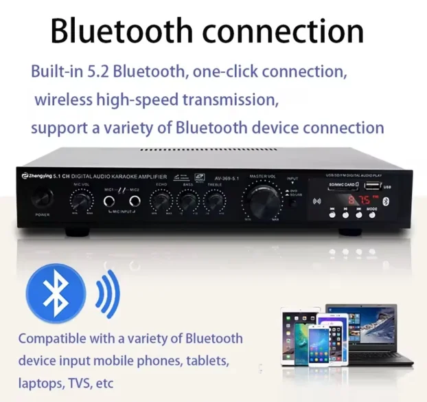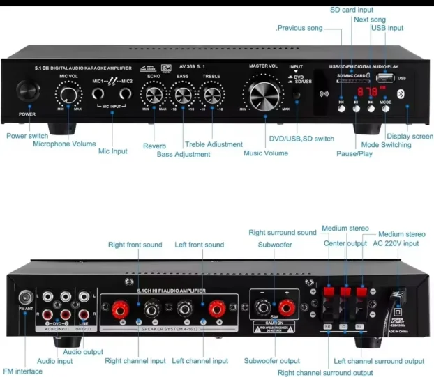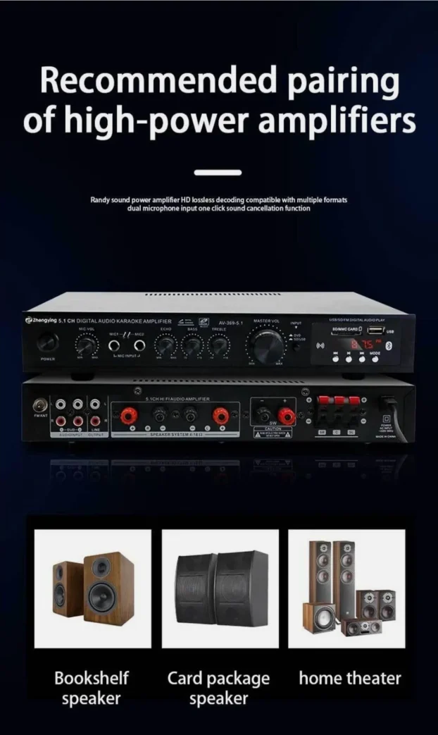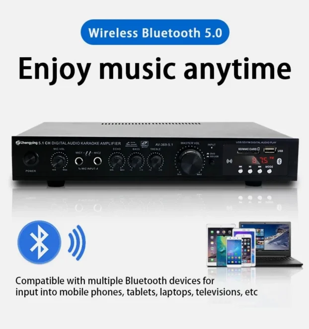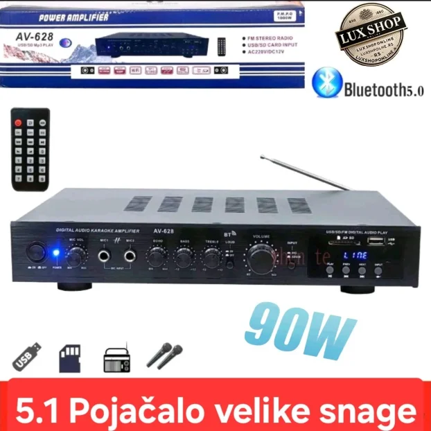 Uživajte u vrhunskom zvuku uz moćno blutut 5.1 audio pojačalo koje transformiše vaše kućno okruženje u pravi bioskopski doživljaj. Ovaj svestrani uređaj integriše napredne audio funkcije sa praktičnošću bežičnog povezivanja, donoseći bogat i čist zvuk direktno u vaš dom.
