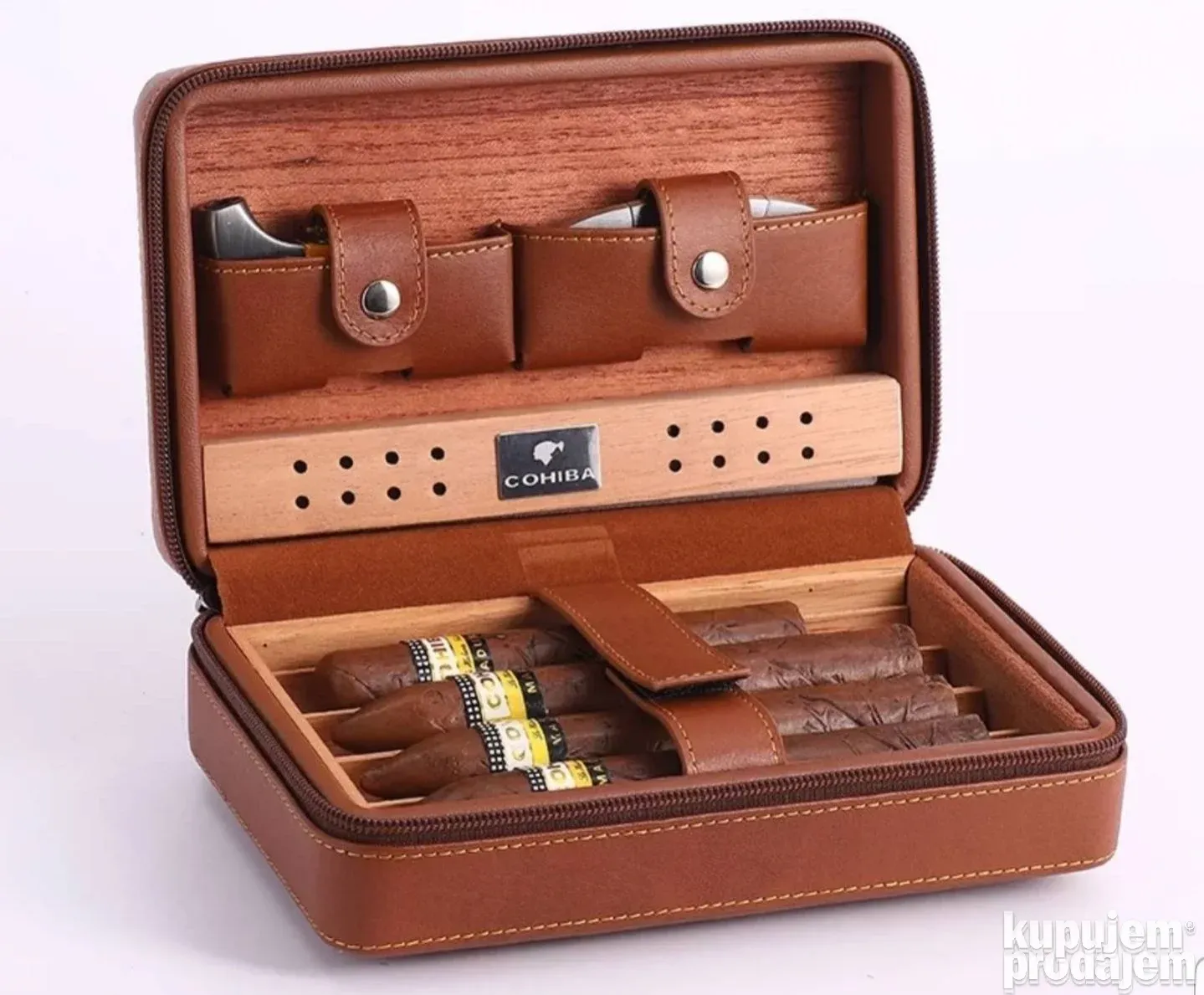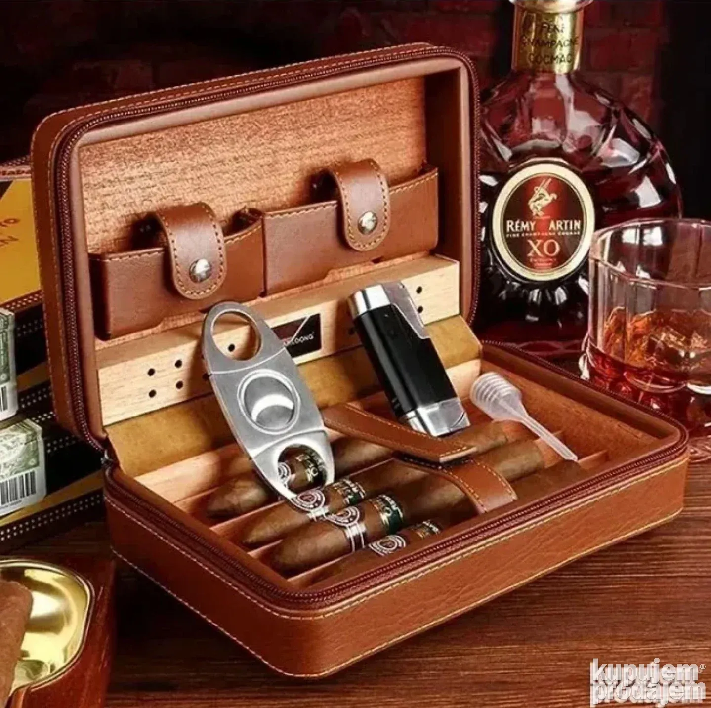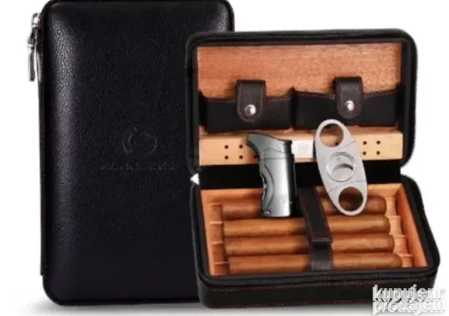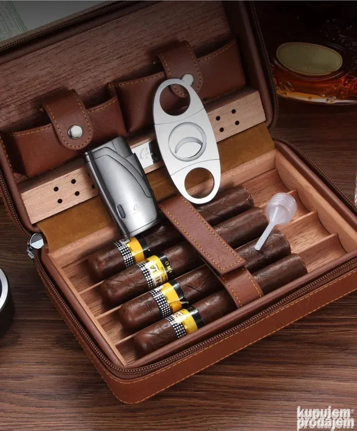 Set uključuje kožni humidor, brener upaljač, sekač za tompuse, kapalicu i brendiranu ambalažu – sve što je potrebno za savršeno uživanje u vašim cigarama.