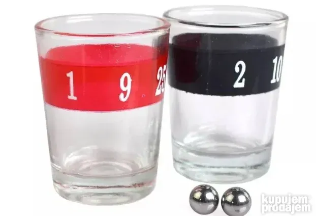 Set sa 16 staklenih čašica i 2 metalne kuglice – spremno za akciju.