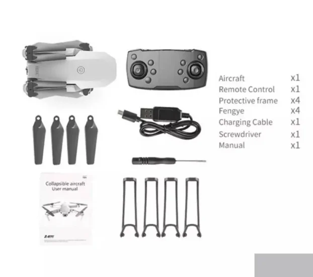 U pakovanju: 1 x mini dron, 1 x upravljač, 1 x USB kabl za punjenje, 4 x zamenljiva propelera.