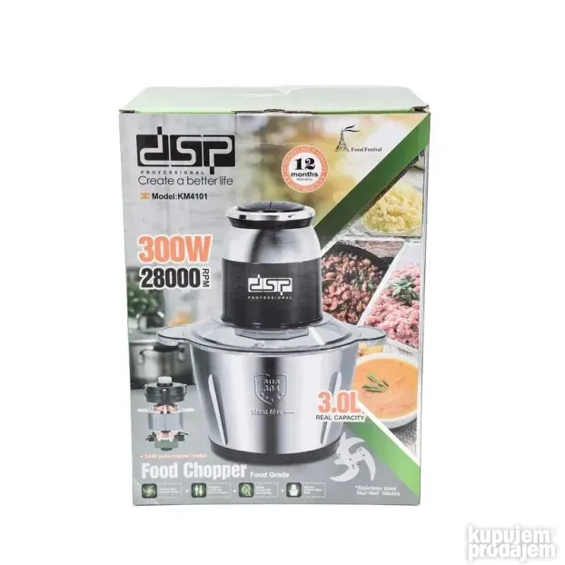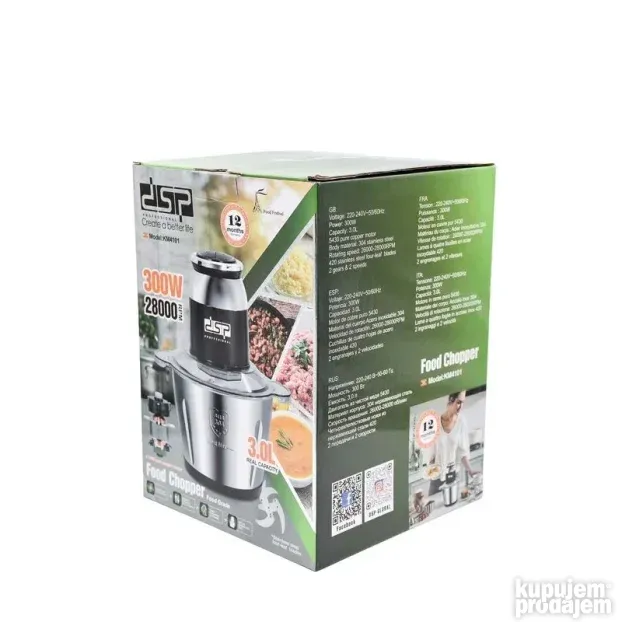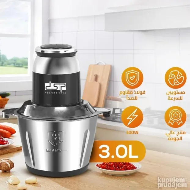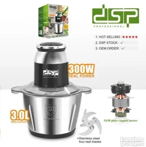 DSP blender i seckalica 3L idealna je za pripremu mesa, voća i povrća. Snaga od 300 W i 30000 obrtaja u minuti omogućava brzo i efikasno seckanje. Opremljena je motorom od čistog bakra i sečivima od nerđajućeg čelika. Dva stepena brzine pružaju kontrolu nad seckanjem, dok rastavljanje i čišćenje uređaja čini jednostavnim i praktičnim za svaku kuhinju. Prostrani kapacitet od 3 litra omogućava obradu većih količina hrane u jednom potezu.