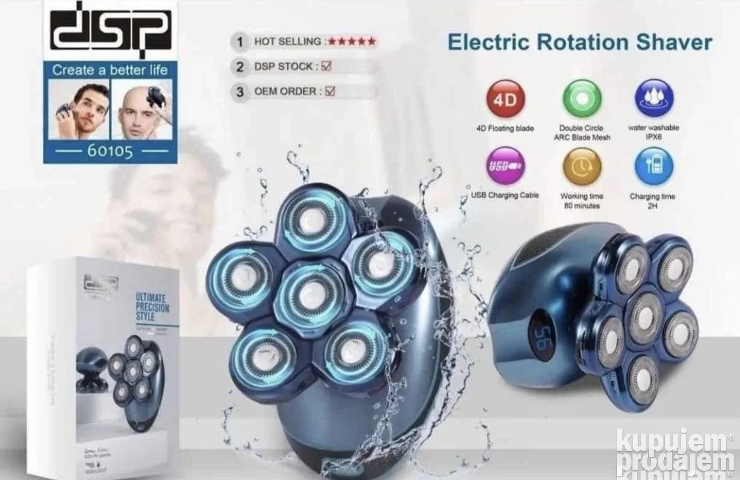 DSP 60105 je profesionalna mašinica za brijanje sa modernim dizajnom i snažnim radom. Vodootporna je po IPX6 standardu, pa se može koristiti i prati pod vodom. Uređaj radi na punjivu bateriju kapaciteta 600 mAh. Puni se 2 sata, a zatim radi do 80 minuta bez prekida.