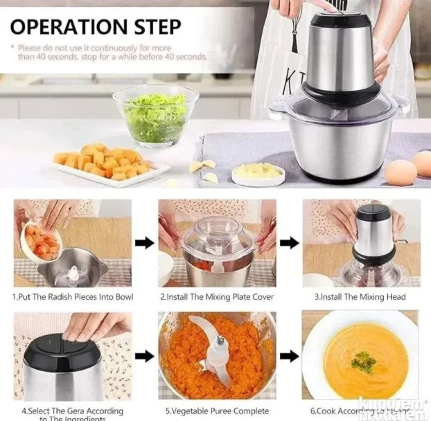 - 🔪 Oštrice: dvostruka oštrica od nerđajućeg čelika za ujednačeno seckanje