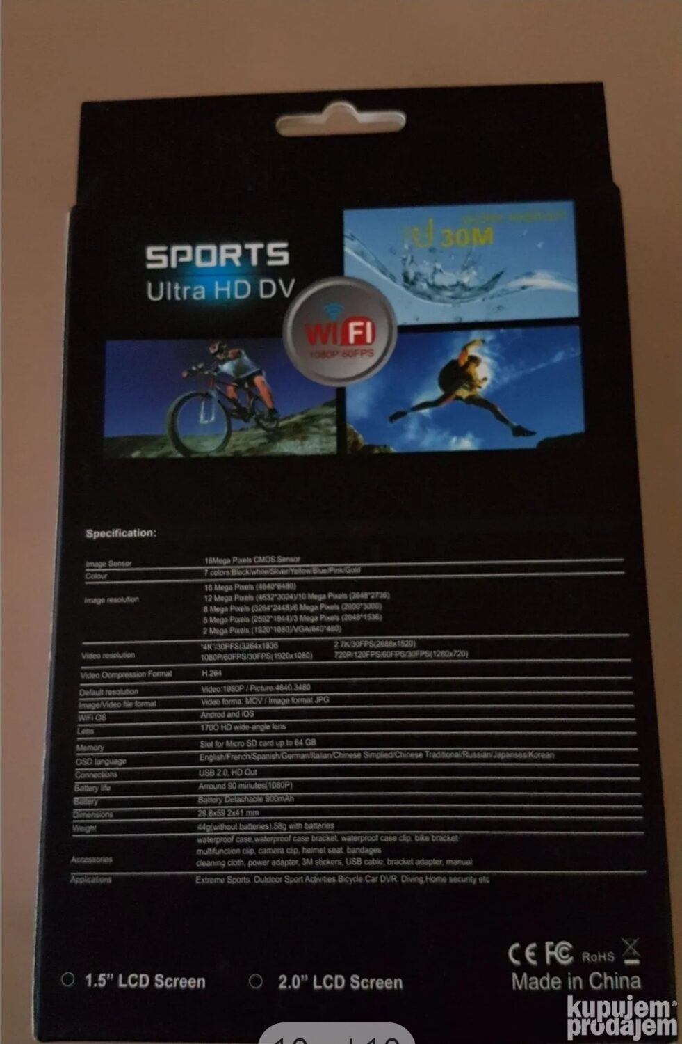 U pakovanju uz kameru dobijate i zaštitno vodonepropusno pakovanje, kao i mnostvo dodataka, koji sluze za fiksiranje kamere na raznim vrstama podloga (kacigu, motor, bicikl, auto).