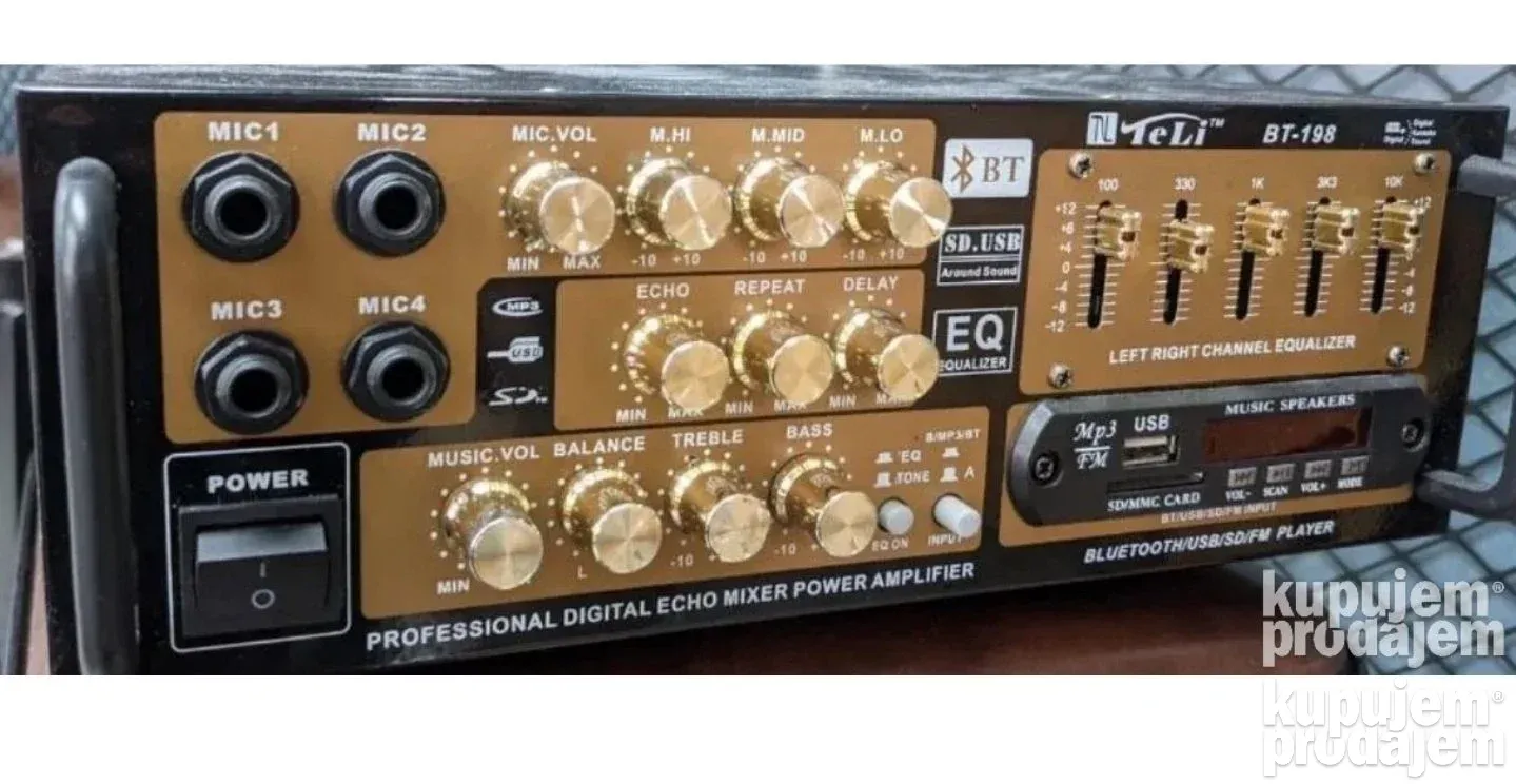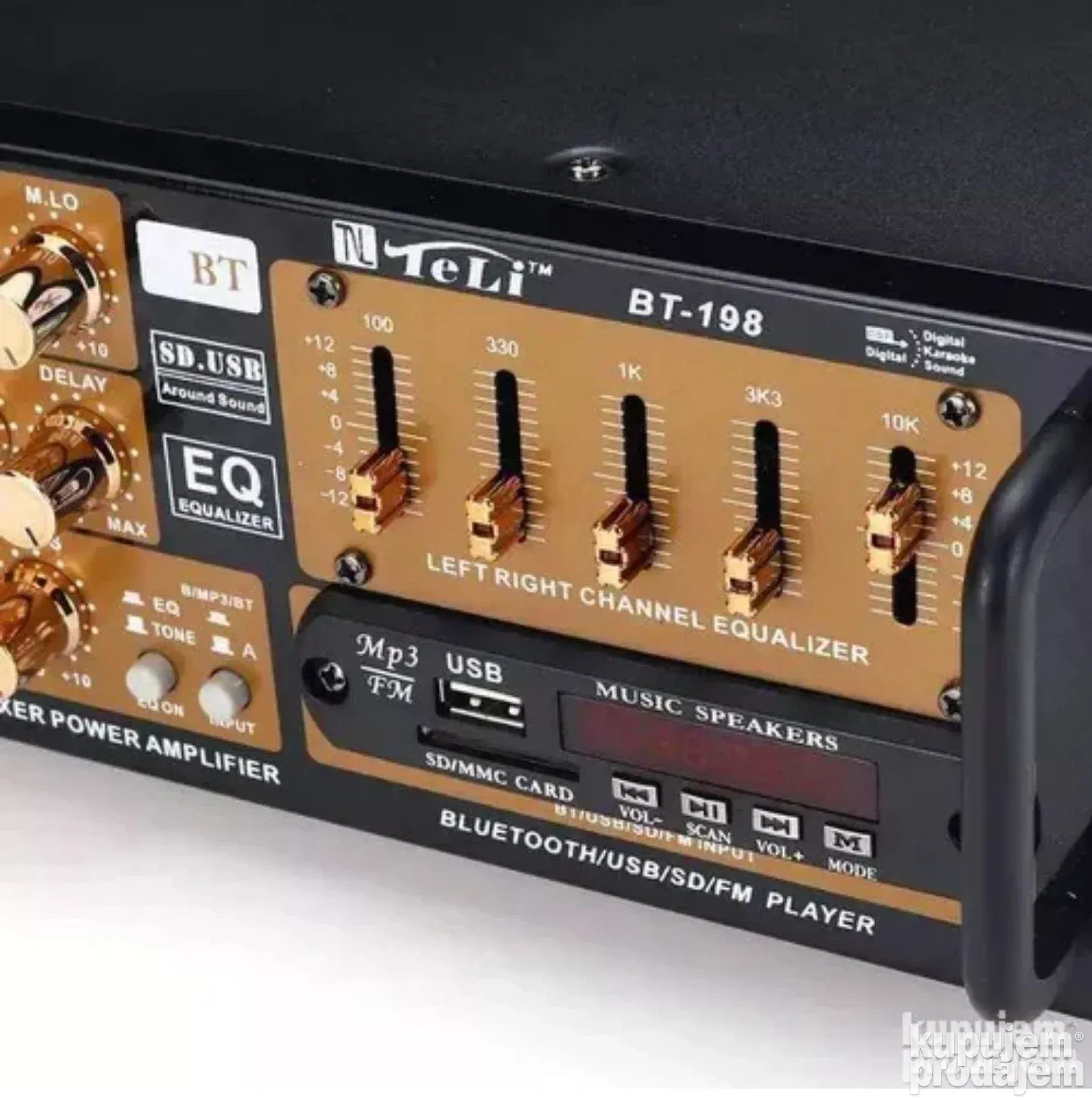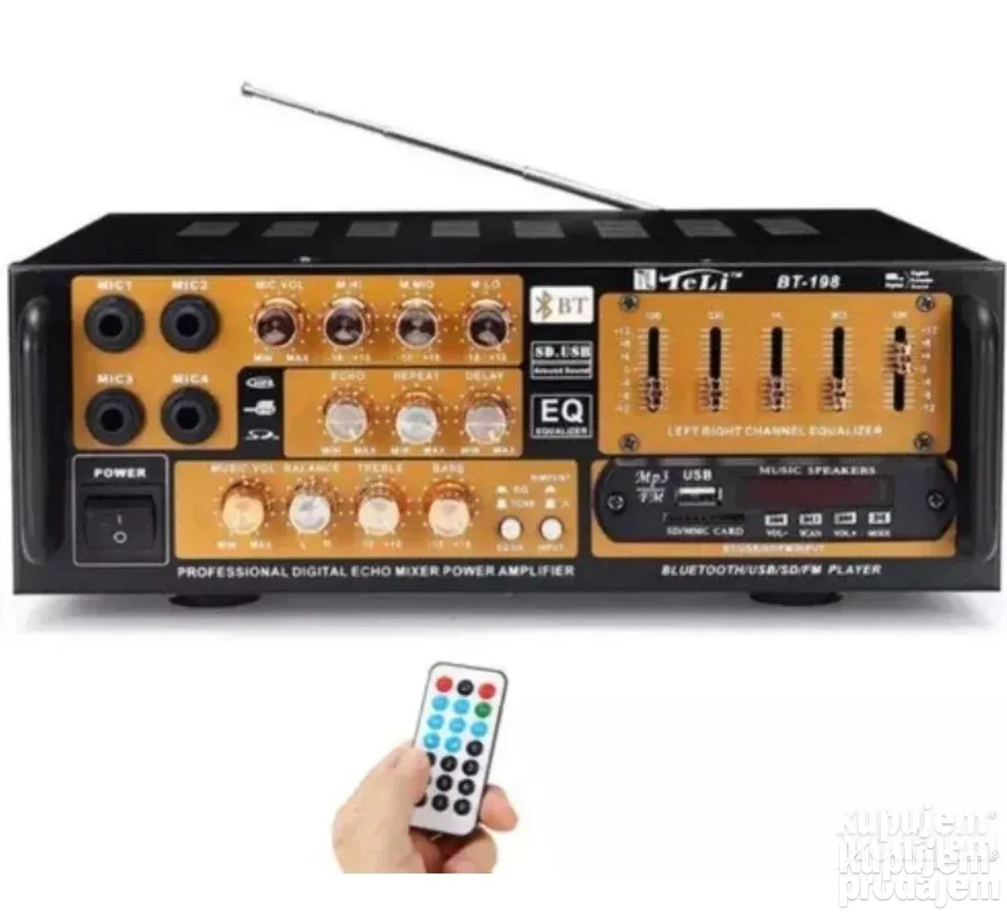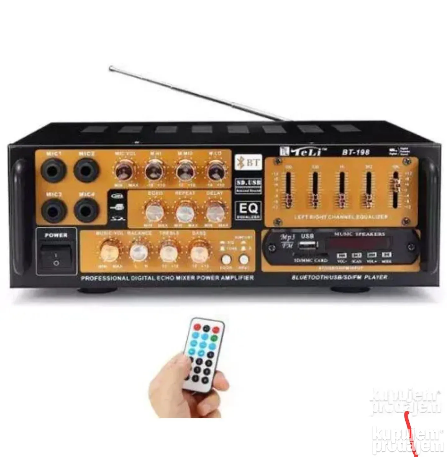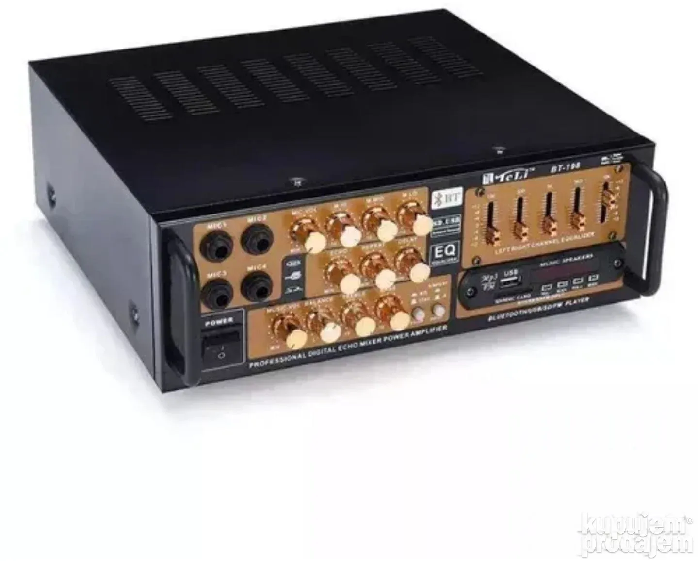 HIFI BT-198 pojačalo je snažan i multifunkcionalan uređaj idealan za kućne zabave, karaoke večeri i kućni bioskop. Pruža snagu od čak 2000W (2x1000V) i podržava bluetooth povezivanje, FM radio, USB, SD kartice i MP3 formate. Uz 4 ulaza za mikrofon, ovo pojačalo je savršeno za porodična okupljanja, proslave ili profesionalnu karaoke upotrebu.