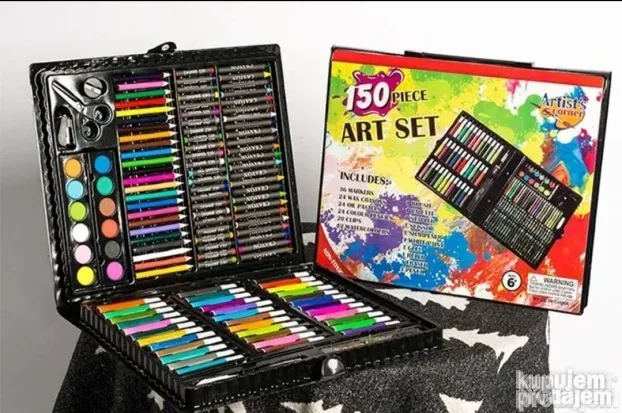 Ovaj kofer sadrži 150 delova za crtanje i bojenje. U setu su flomasteri, voštane i uljne bojice, drvene i vodene boje. Tu su i paleta, četkica, makaze, lepak, lenjir i gumica.