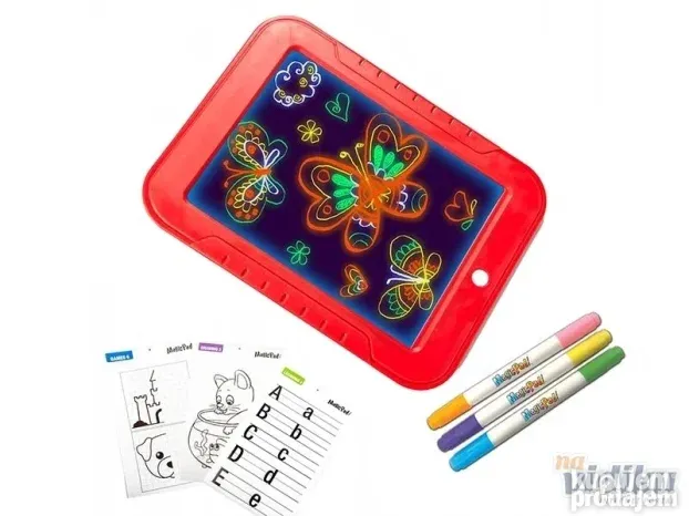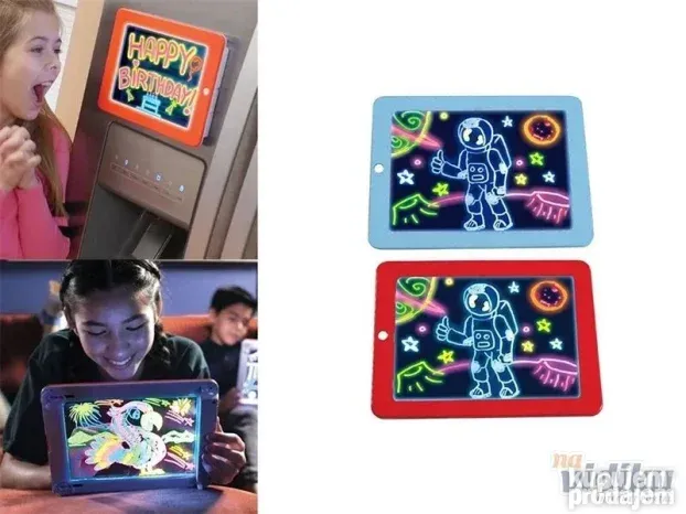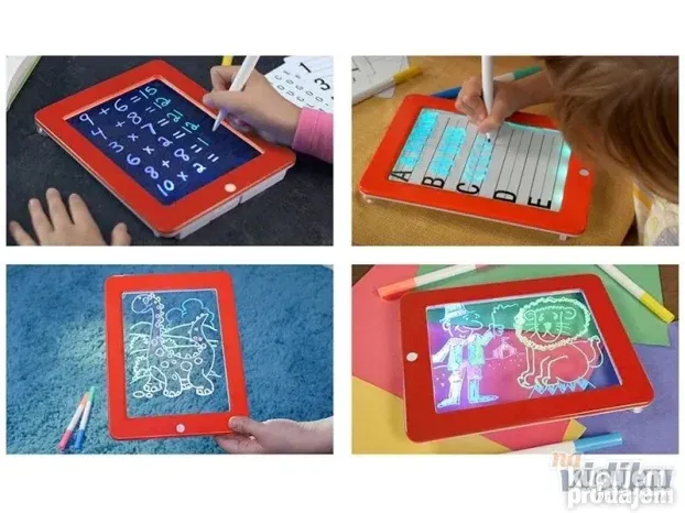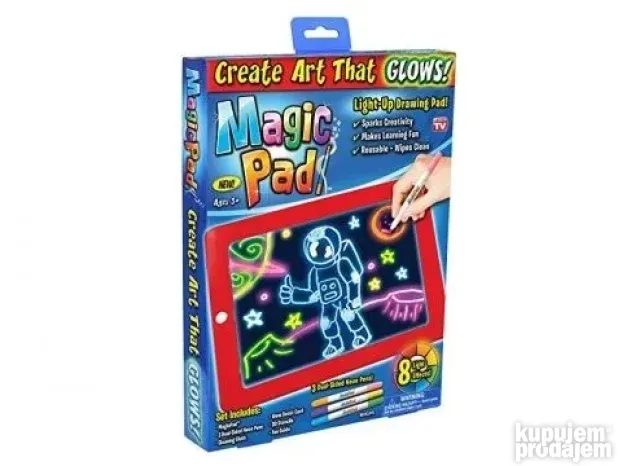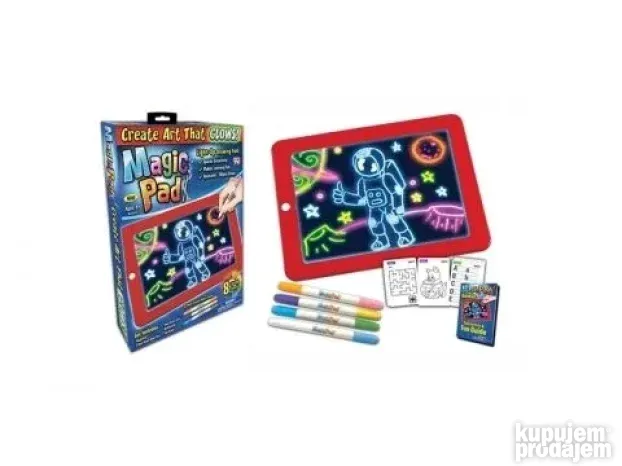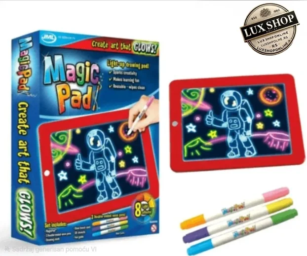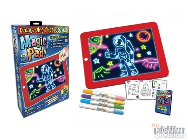 **Magic Pad Svetleća Tabla** – Savršen poklon za razvoj kreativnosti! Vaše dete će uživati u crtanju slika koje svetle u mraku uz 8 fantastičnih efekata. Briše se maramicom! Lako, zabavno i edukativno.