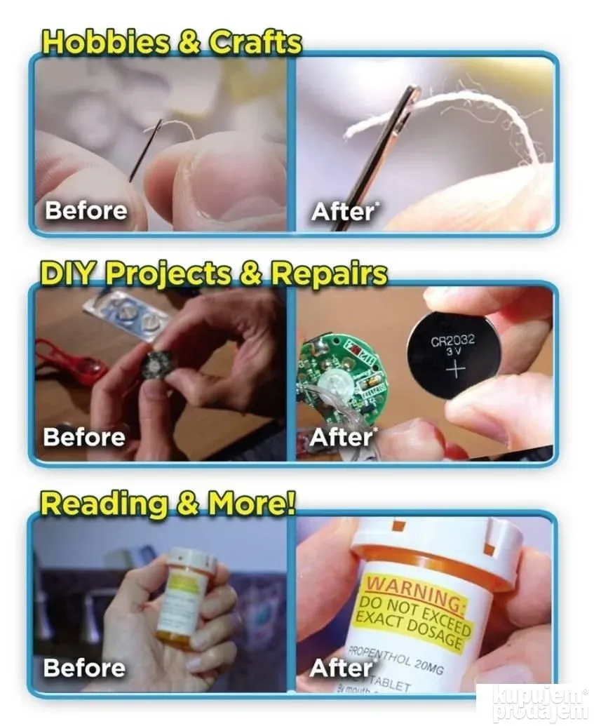 Za razliku od običnih lupa koje zahtevaju držanje i dodatno svetlo, Mighty Sight vam oslobađa ruke i pruža uveličanje sa osvetljenjem, sve u jednom uređaju. Savršene su za starije osobe, hobiste i sve koji žele bolju vidljivost bez naprezanja očiju.