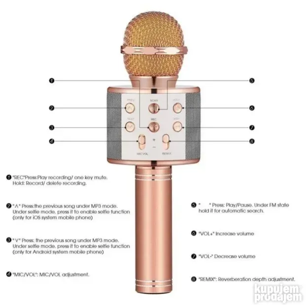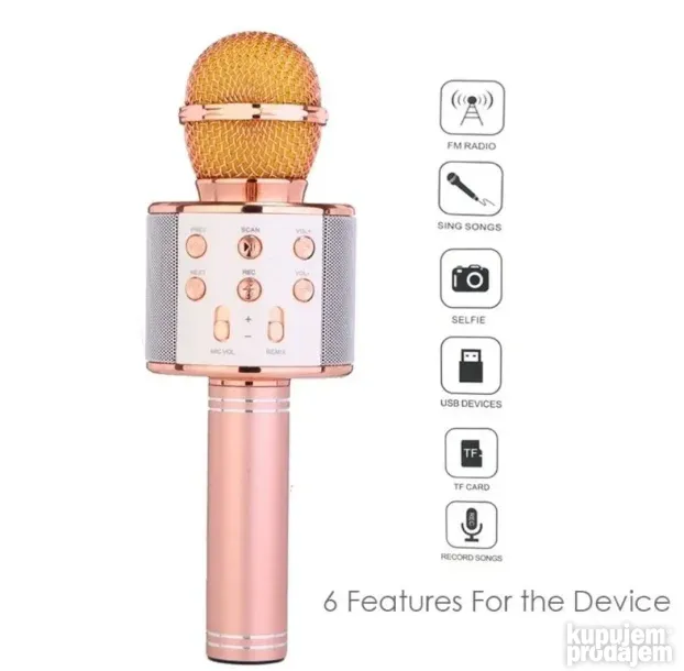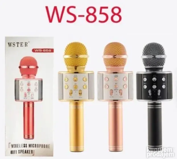 Mikrofon Karaoke WS-858 pruža čist zvuk bez šuma i izobličenja. Echo funkcija omogućava kvalitetno pevanje pri maksimalnom volumenu. Baterija od 1500 mAh traje 3-6 sati. Povezuje se sa Android i iOS uređajima putem Bluetooth-a, USB-a, 3,5 mm kabla ili Micro SD kartice. Dostupan je u više boja: svetlo rozi, tamno rozi, zlatni, crni i plavi. Dimenzije su pogodne za lako držanje i igru.