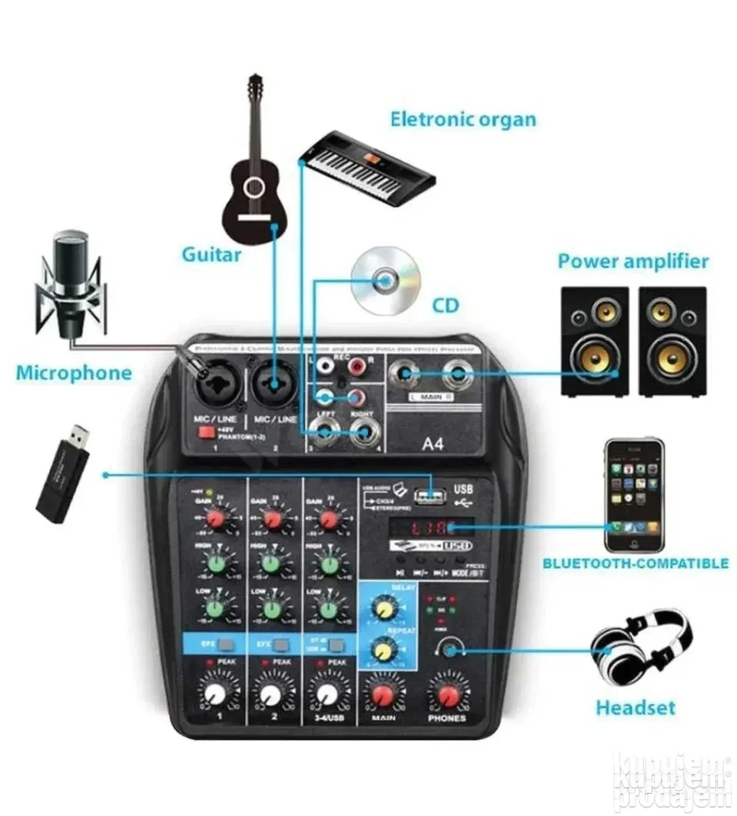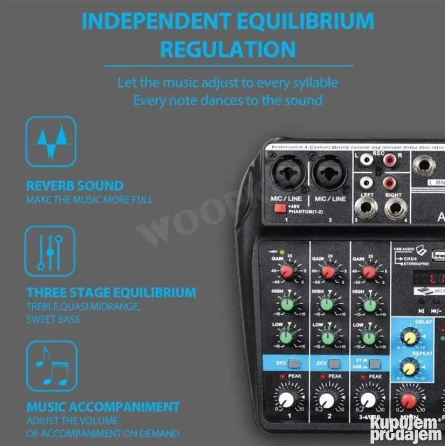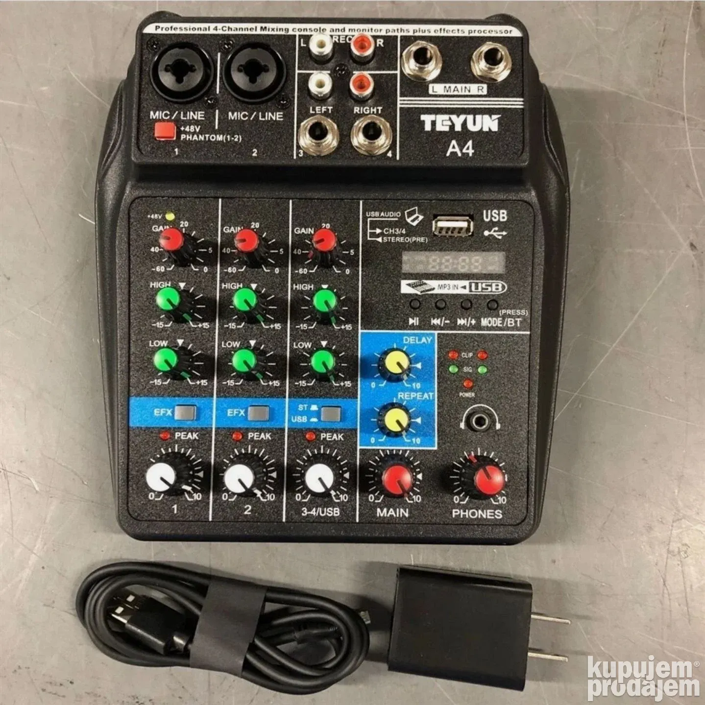 Profesionalna četvorokanalna mikseta USB Bluetooth je namenjena muzičarima, streamerima, DJ-evima i svima koji žele kvalitetan zvuk u kompaktnoj formi. Ova mikseta omogućava miksovanje više izvora zvuka, povezivanje sa računarom, snimanje, puštanje muzike i bežičnu Bluetooth vezu. Idealna je za studio, live nastupe, kućne žurke i profesionalne događaje.