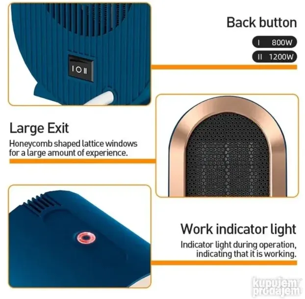 Mini grejalica ima dva nivoa grejanja: 800V za nisku temperaturu i 1200V za visoku. Niska toplota štedi energiju i smanjuje račun za struju, dok visoka brzo zagreva prostor.