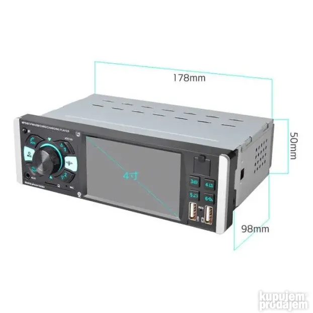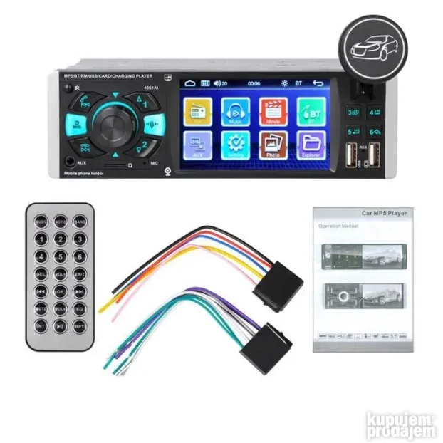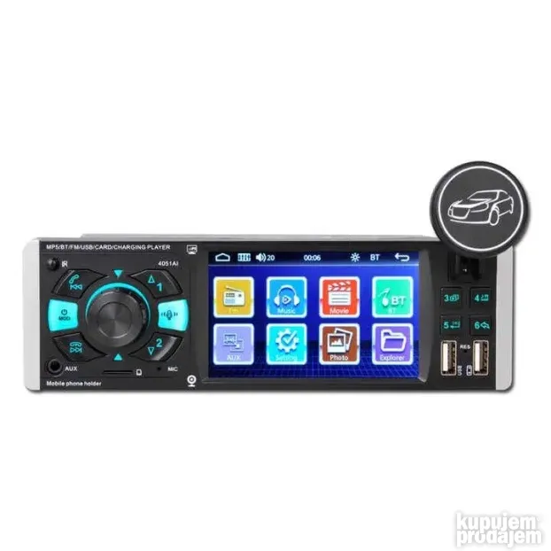 Univerzalni MP5 audio plejer za auto dolazi sa TFT ekranom od 4,1 inča i integrisanim držačem telefona. Ima FM radio, Bluetooth i mikrofon za hands-free pozive. Povezuje se sa audio uređajima preko AUKS izlaza. Moguć je priključak kamere za vožnju unazad (kamera nije uključena).