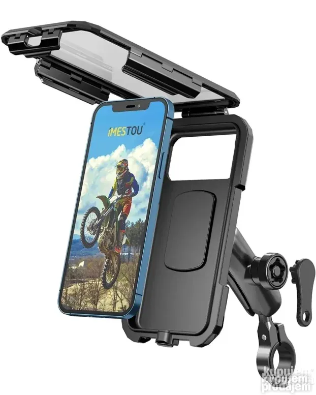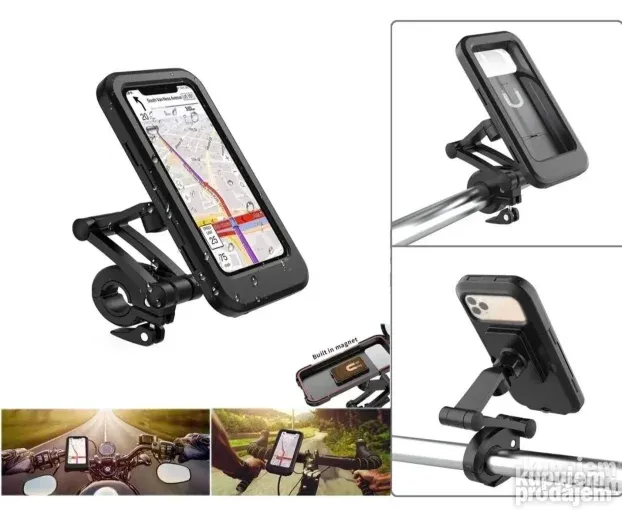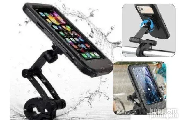Ovaj držač omogućava sigurno snimanje i navigaciju tokom vožnje. Vodootporan je, otporan na udarce i kompatibilan sa većinom telefona. Savršen za bicikliste, putnike i avanturiste.