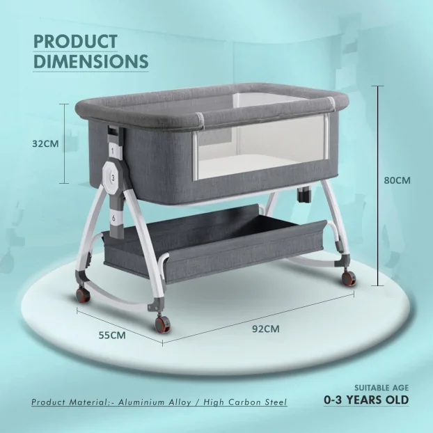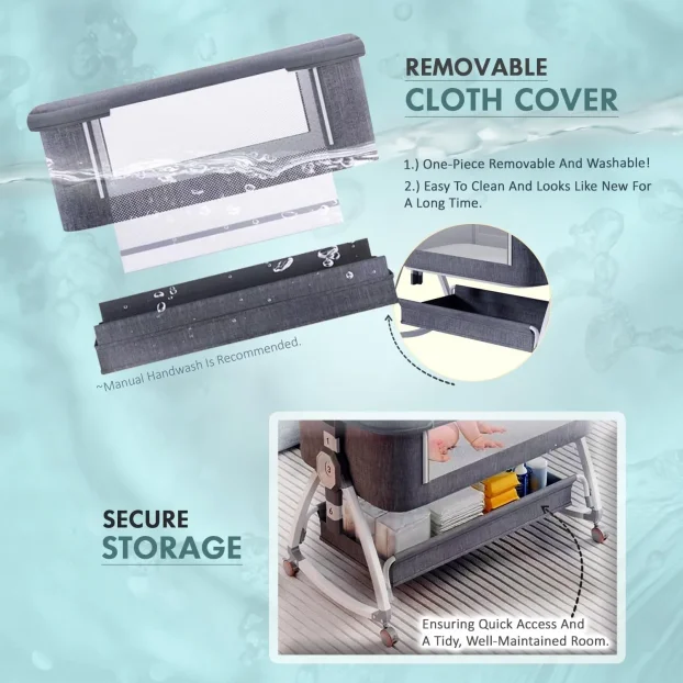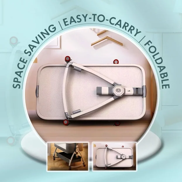 Točkovi se okreću 360° sa tihim kretanjem i sigurnim kočnicama. Prostorna korpa ispod kreveta omogućava čuvanje pelena, vlažnih maramica i odeće nadohvat ruke.