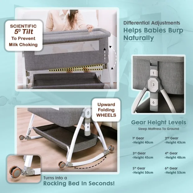 Uzglavlje se podešava u šest nivoa (40–53 cm), što omogućava lako poravnanje sa roditeljskim krevetom. Nagib pomaže kod refluksa i udobnog hranjenja.