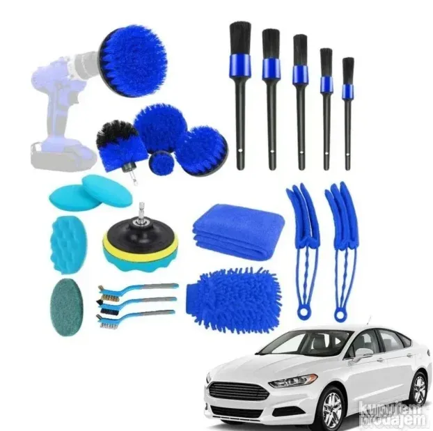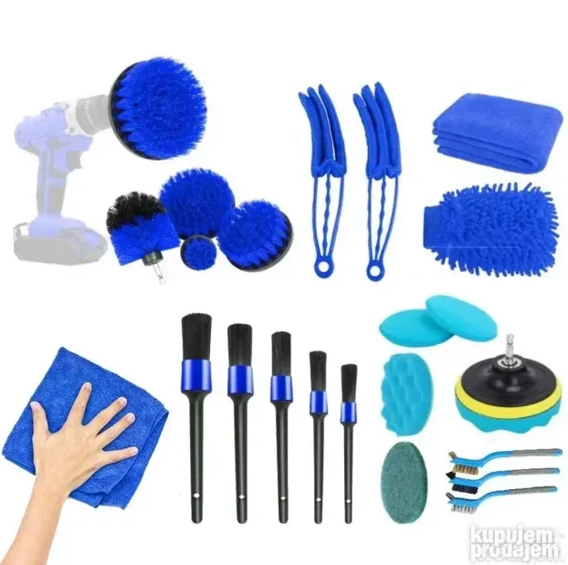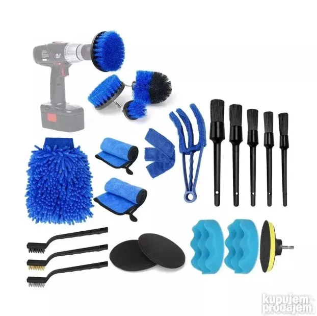 Ovaj komplet alata olakšava čišćenje automobila od unutrašnjosti do spoljašnjosti. Idealno za točkove, instrument tablu, kožu, ventile i ambleme. Sve četkice i pribor su profesionalni i visokog kvaliteta. U pakovanju dobijate: komplet alata, set četkica za detalje i električne četke, četke za točkove, instrument tablu, unutrašnjost, kožu, ventile, ambleme, jastučić od mikrovlakana, rukavicu, dve četke za ventilaciju i peškir. Najbolji set za detaljno čišćenje – motori, felge, gume, sedišta, rešetke, branici i ventilacioni otvori.