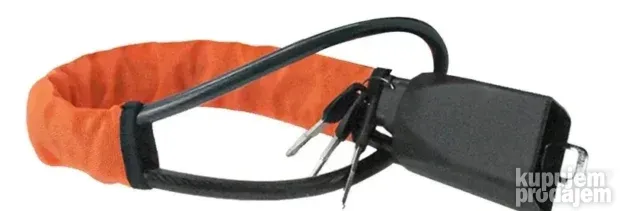 Mali i lagan, lako se postavlja i uklanja za nekoliko sekundi. Omotajte čeličnu žicu kućišta brave oko volana i prođite kroz telo brave. Umetnite deo za zaključavanje u karticu pojasa i pritisnite. Za otključavanje umetnite ključ, okrenite ulevo i pritisnite nadole.