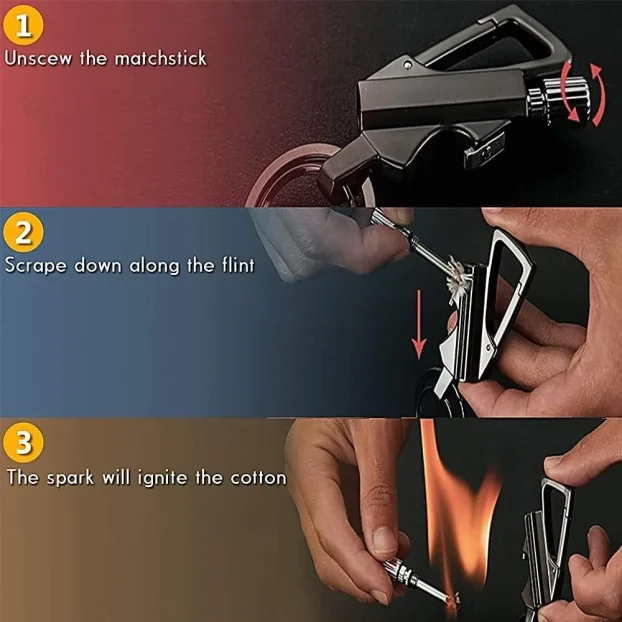 - ✅ Višenamenski alat – kombinuje kremenski starter, punjivi kerozin upaljač, otvarač za flaše i prsten za ključeve.