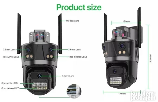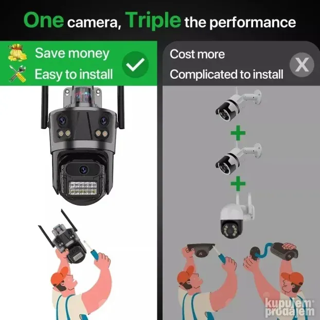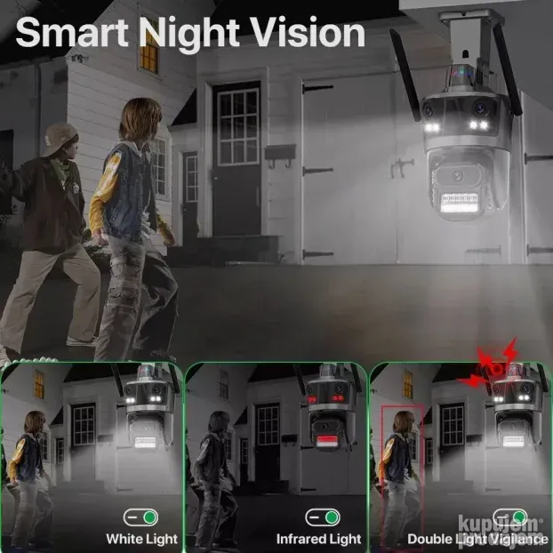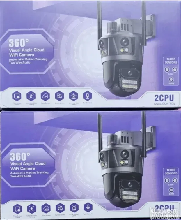 Ova IP Wi-Fi kamera sa tri objektiva pruža potpunu kontrolu nad nadzornim prostorom. Dva sočiva su fiksna, dok treće omogućava rotaciju za bolji pregled okoline.
