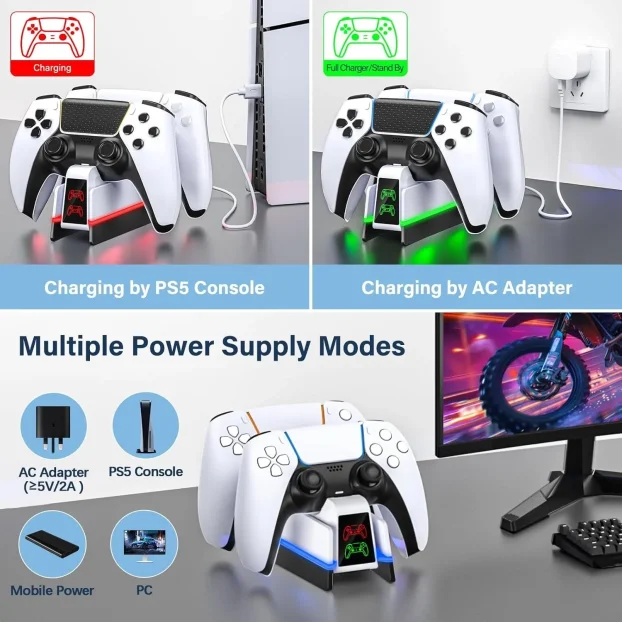 Twin Charge 5 punjač omogućava istovremeno punjenje dva PS5 DualSense kontrolera. Elegantno rešava problem pražnjenja baterija tokom igranja. Brzina punjenja je ista kao i preko standardnog USB-C kabla koji dolazi uz konzolu. Zahteva samo jedan kabl i drži vaše kontrolere uvek spremnim za igru. Stalak je jednostavan za korišćenje – dovoljno je da ostavite kontroler u doku i baterija se puni. Sa Twin Charge 5, nikad nećete morati da prekidate igranje zbog prazne baterije.