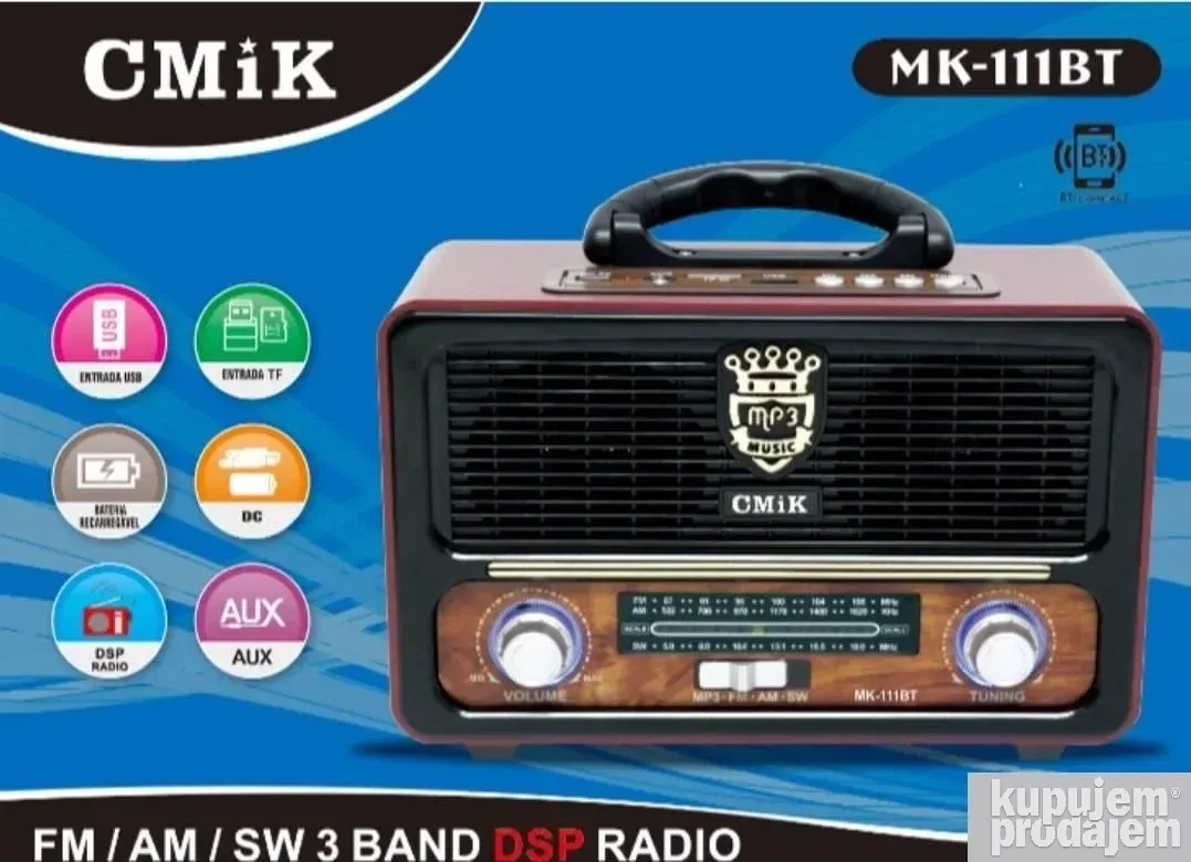 Retro radio model CMIK MK-111BT nudi vrhunske funkcije za sve ljubitelje klasičnog i modernog zvuka. Ovaj uređaj podržava MP3 i WMA formate, ima FM radio i Bluetooth povezivanje za lako bežično puštanje muzike. Ulazi za USB i microSD karticu omogućavaju reprodukciju omiljenih pesama direktno sa fleš memorije ili kartice.