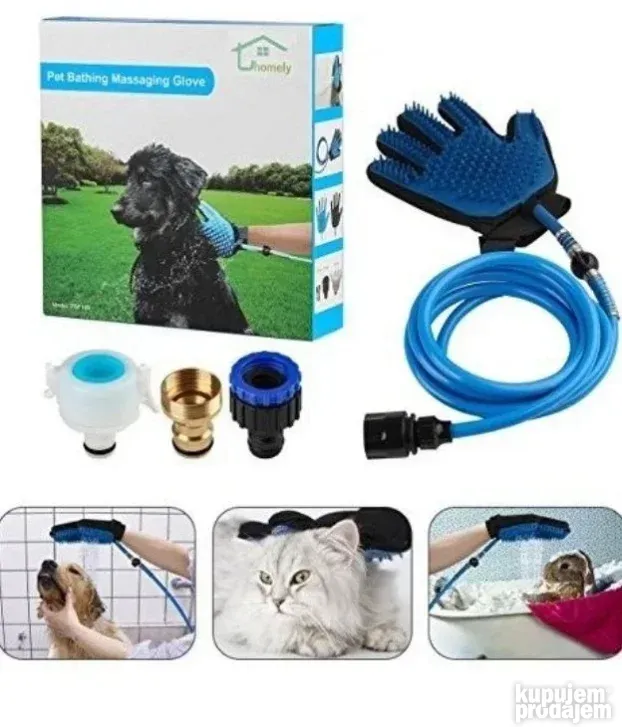 Rukavica za kupanje ljubimaca omogućava jednostavno čišćenje i kupanje vašeg ljubimca uz nežnu masažu. Mekani silikonski vrhovi smanjuju stres i ne povređuju kožu, što je idealno za duge, kratke i kovrdžave dlake. Pet prstiju rukavice omogućava da dođete i do teško dostupnih mesta poput lica. Univerzalna veličina sa podesivom trakom za nošenje čini je praktičnom za sve ljubimce. Raspršivač vode sa tri adaptera može se koristiti u više varijacija sudopera i na otvorenom, bez potrebe za dodatnim komponentama. Savršen je alat za higijenu, masažu i negu ljubimaca.
