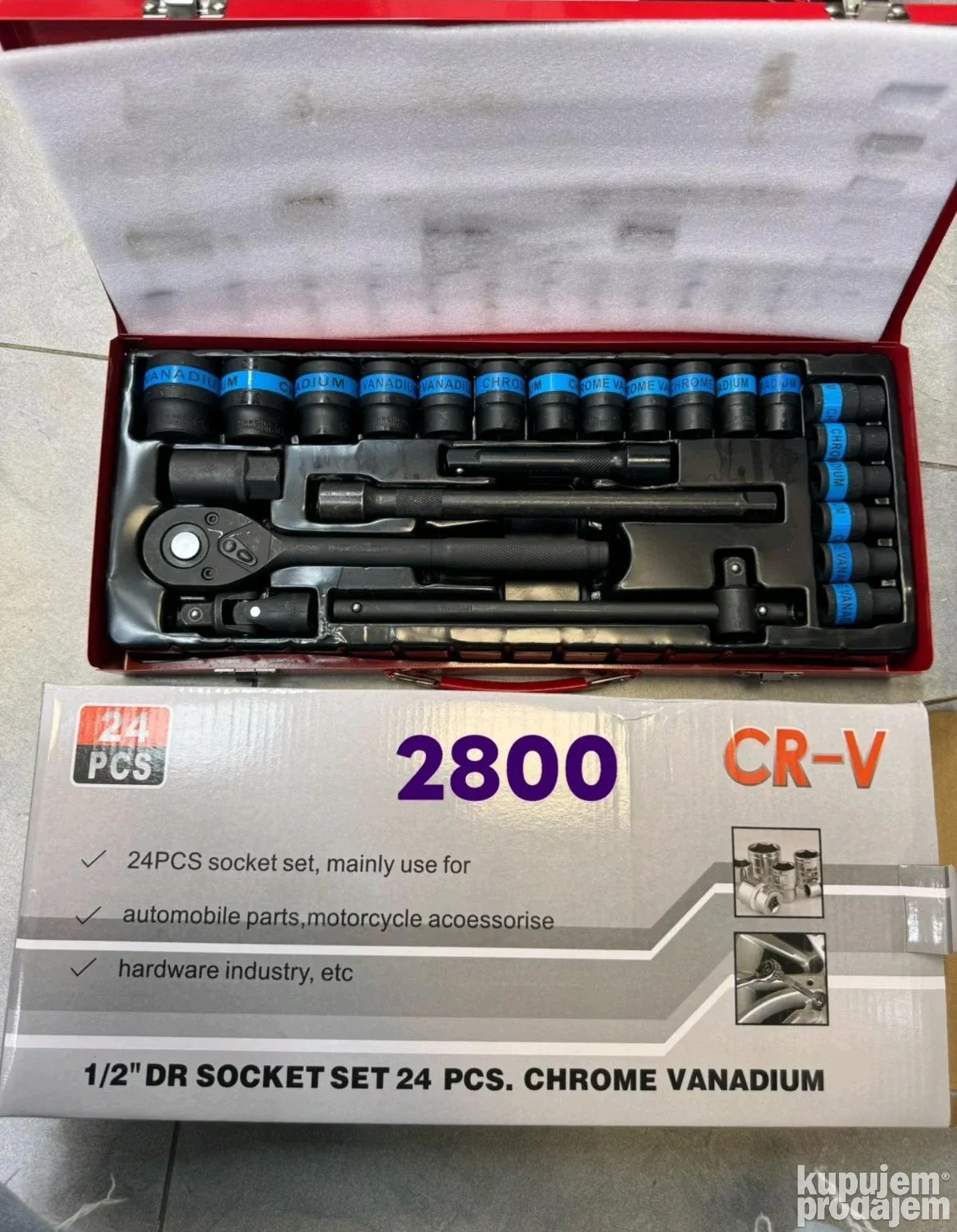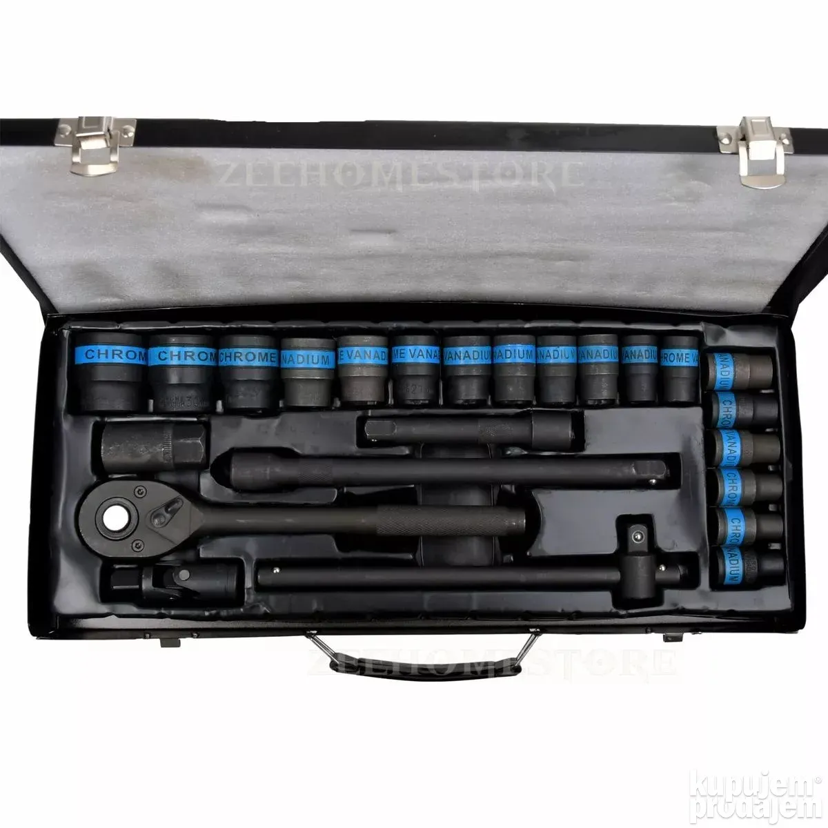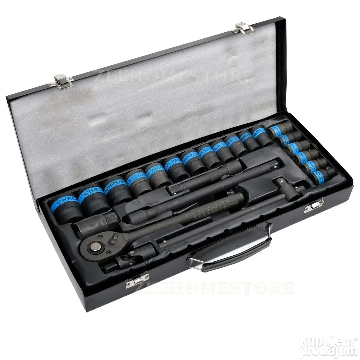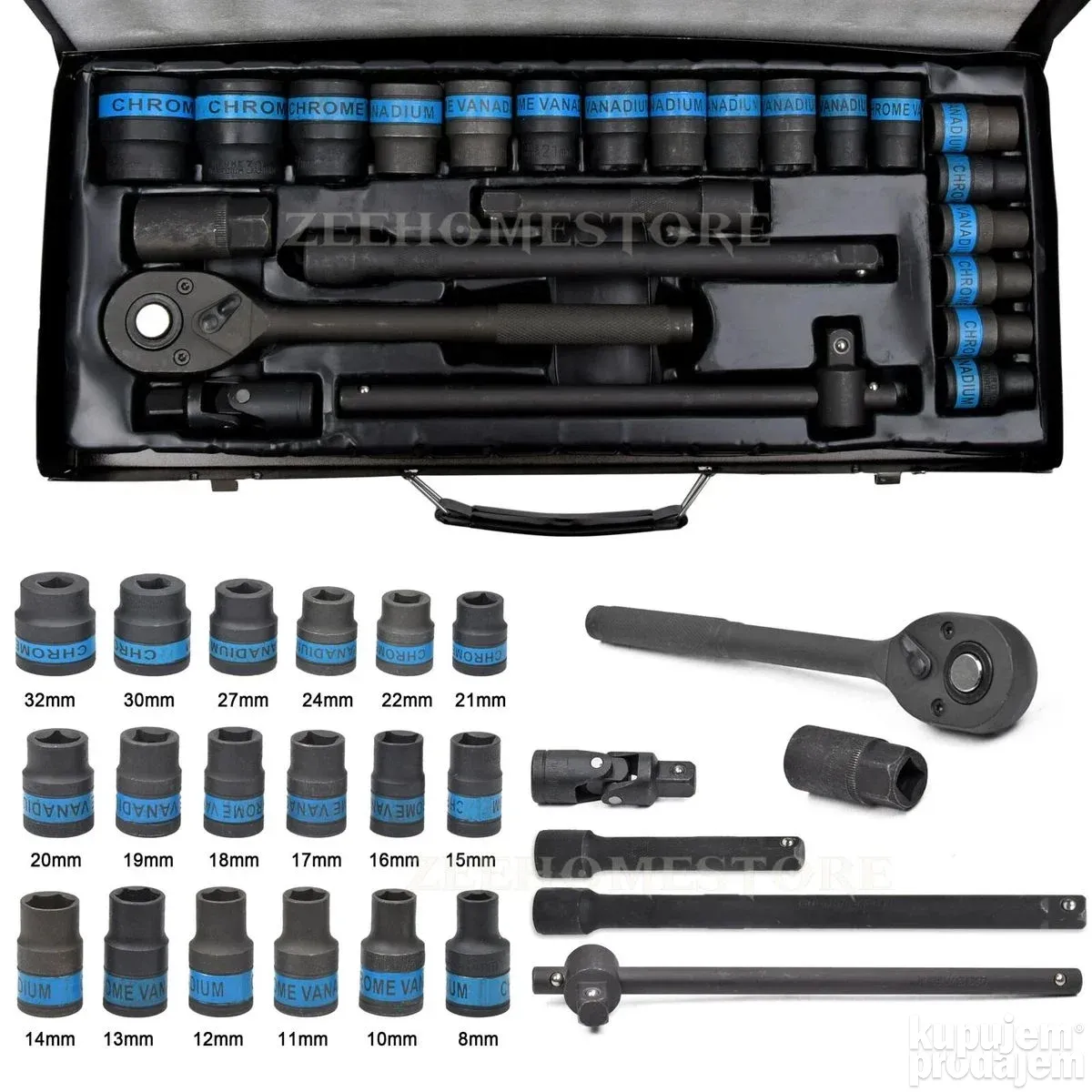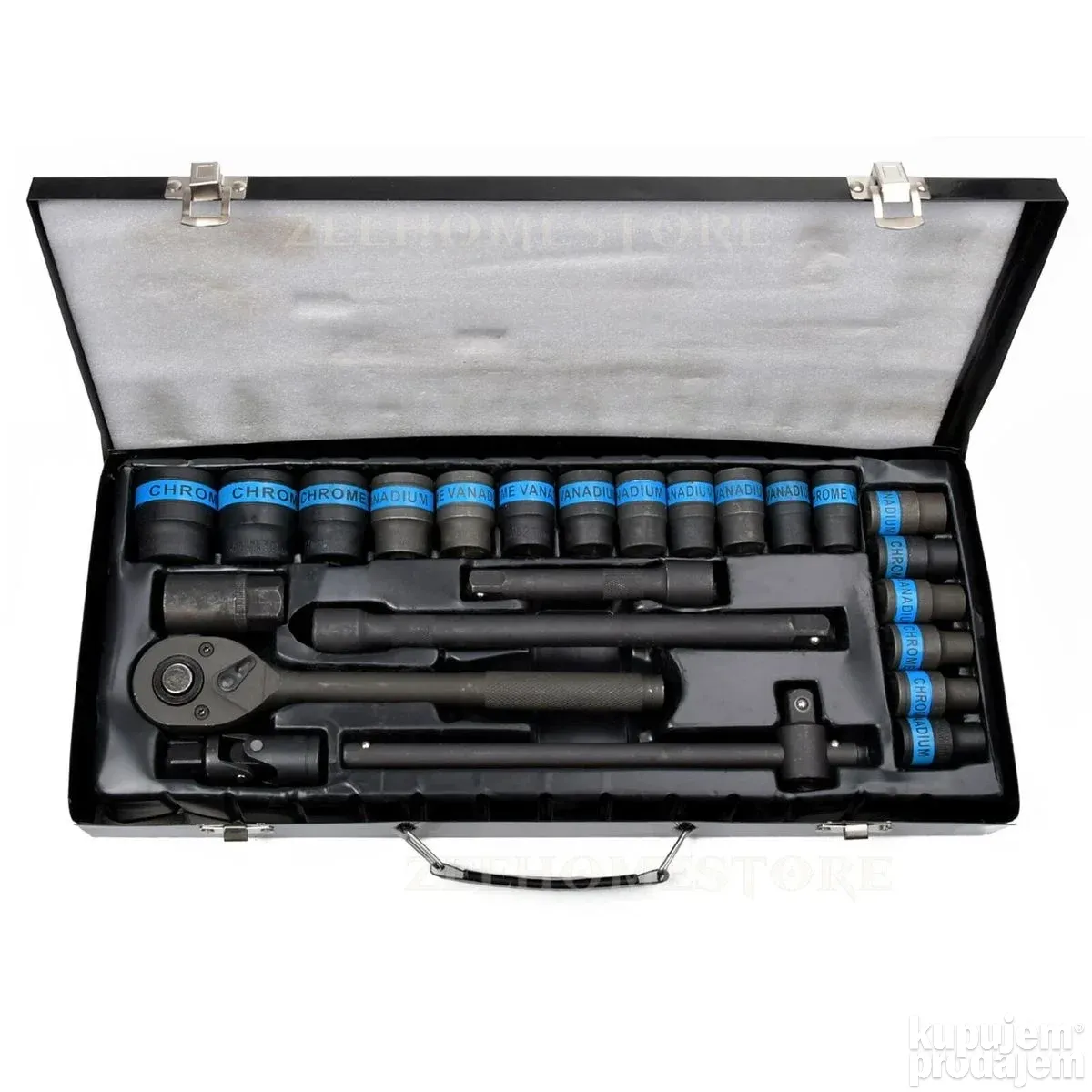 U kompletu dobijate širok spektar čaura 8–32 mm, produžetke, univerzalni zglob, T-oblik šipku, ključ za svećice i čegrtaljku 1/2″, sve uredno spakovano u čvrstu metalnu kutiju.