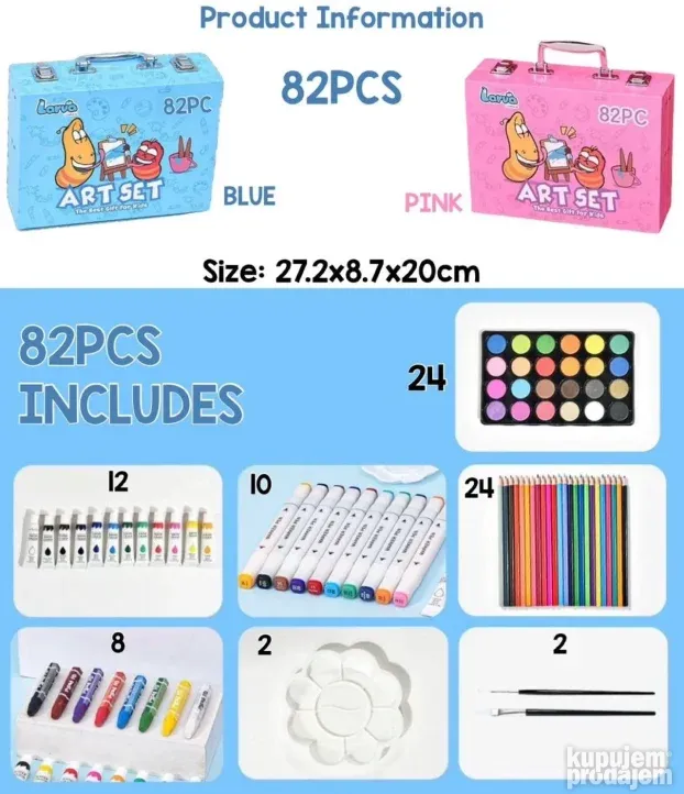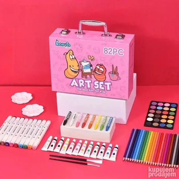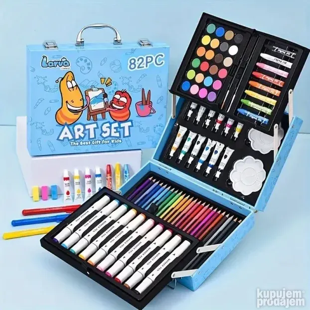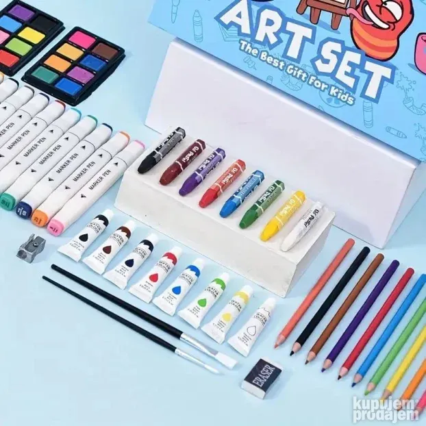 U kompletu su drvene bojice, voštane bojice, tempere, flomasteri, vodene boje, posuda za boje i više vrsta četkica.