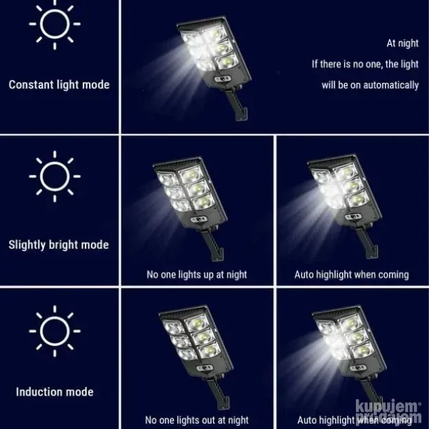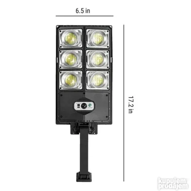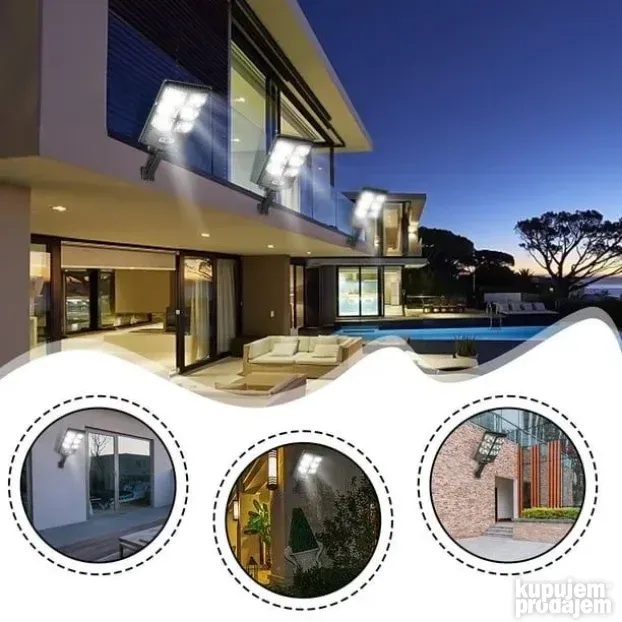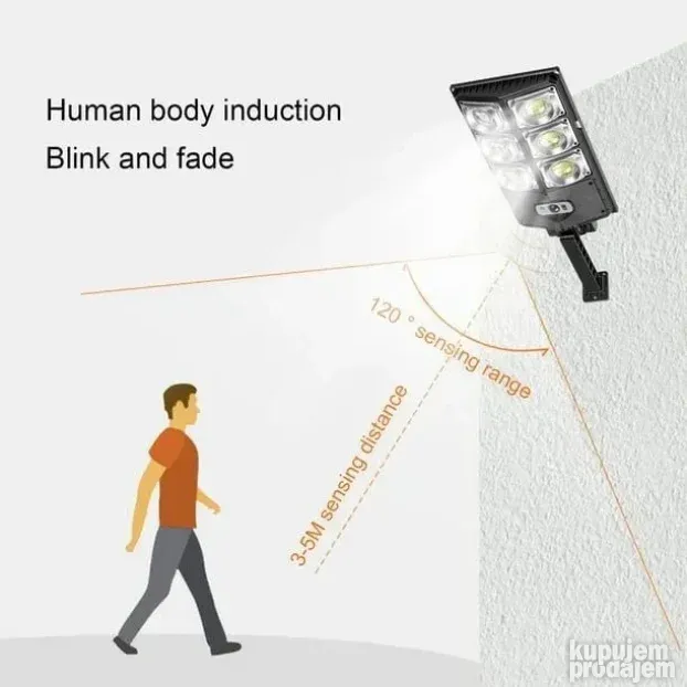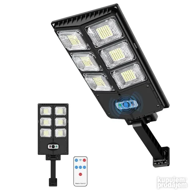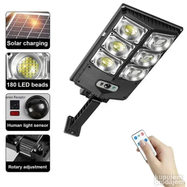 Ovaj solarni reflektor od 300W osvetljava široke površine koristeći 180 LED dioda. Dolazi sa ugrađenim senzorom pokreta koji detektuje kretanje do 5 metara i automatski uključuje svetlo. Možete birati između tri režima osvetljenja: jaka svetlost pri detekciji, slabija svetlost kada nema pokreta i stalno svetlo. Napravljen je od čvrstog ABS plastike i otporan je na kišu i prašinu (IP65). Jednostavan je za montažu – samo zakačite na zid bez dodatnog ožičenja. U paketu dolazi i daljinski upravljač za lakšu kontrolu.