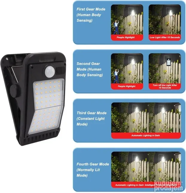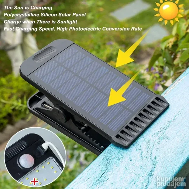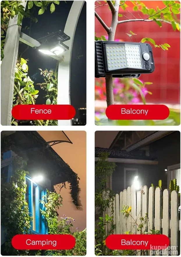 Opremljen je sa 72 LED svetla i USB punjenjem, što omogućava rad i bez direktnog sunca.