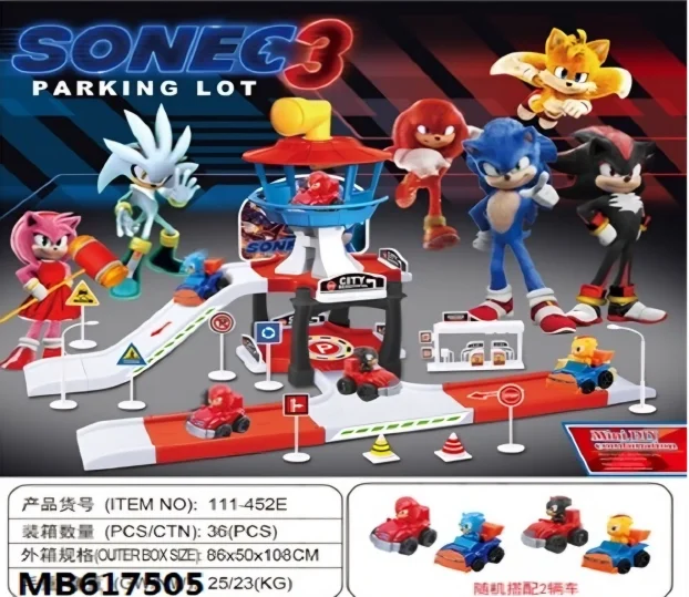 Set uključuje: Parking platformu, delove staze, kontrolni toranj, 2 automobila (Sonic stil) i figure (zavisno od pakovanja).