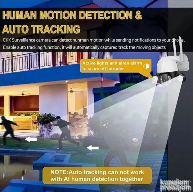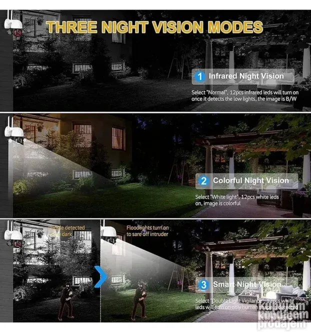 Ugrađeni mikrofon i zvučnik omogućavaju dvosmernu audio komunikaciju. Color Night Vision + IR funkcija ima tri režima: auto mod, IC režim i režim boje, što omogućava jasnu sliku i noću. Funkcija zvučnog i svetlosnog alarma detektuje osobe i pokret u realnom vremenu.