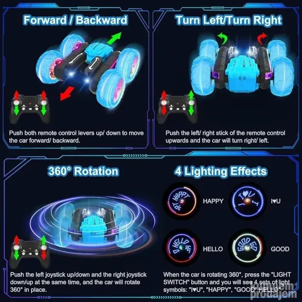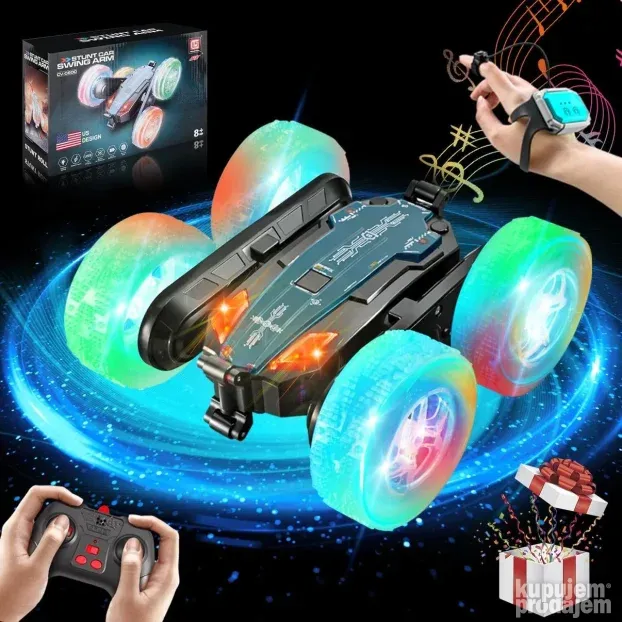 Stunt Car je kaskaderski auto sa daljinskim upravljačem. Bionički dizajn omogućava prelazak između režima na putu i van puta. Snažan motor i pogon na sva četiri točka savladavaju razne terene. Automobil ima sat za kontrolu pokreta, pa ga možete upravljati pomeranjem ruke ili uvrtanjem zgloba. Predajnik radi na 2,4 GHz i omogućava kontrolu do 50 metara, bez smetnji kada više automobila radi istovremeno. Automobil ima kul svetla, a daljinski upravljač menja boje za cool vizuelne efekte noću.