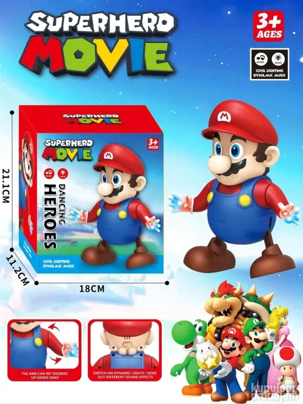 Očaravajući Super Mario donosi radost i osmeh na lica mališana. Sa šarmantnim dizajnom i realističnim pokretima, savršen je za igru i praznične trenutke. Peva vesele melodije i pleše uz muziku, dok LED svetla dodaju magičan sjaj svakoj prostoriji. Interaktivna i zabavna predstava privlači i decu i odrasle. Radi na 3 x AA baterije (nisu uključene), a dimenzije su 21x10x18 cm.
