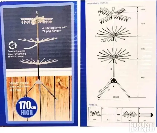 Ima 4 rotirajuće ruke i funkciju rotacije od 360°. Na njima se nalazi ukupno 24 vešalice, idealne za kačenje košulja, majica i haljina. Čvrsto postolje sa neklizajućim nogama obezbeđuje stabilnost.