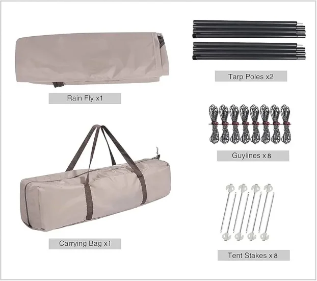 • Održavanje i montaža: tenda se lako postavlja uz dve osobe; dolazi sa sidrištima pogodnim za pesak, travnate površine i kamenite terene