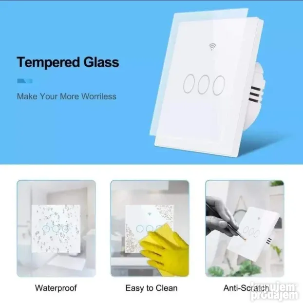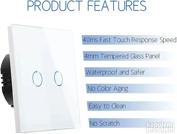 Prekidač je izrađen od kaljenog stakla sa visokim sjajem i modernim dizajnom.