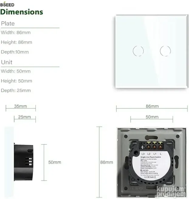 Dimenzije prekidača su 86x86mm.