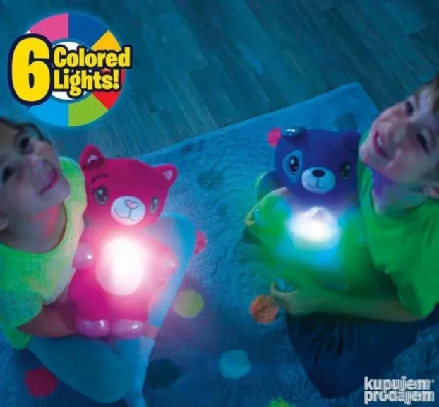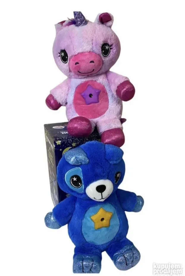 Ovaj plišani meda projektor stvara zvezdano nebo u šest boja: ljubičasta, plava, zelena, svetlo plava i žuta. Jednim pritiskom na dugme soba se puni svetlom i zvezdama u boji koju izaberete. Igračka je od mekanog plisa koji pruža udobnost i miran san. Dostupna je u plavoj i roze varijanti – meda ili jednorog. Projektor radi na 3 AAA baterije (nisu uključene).